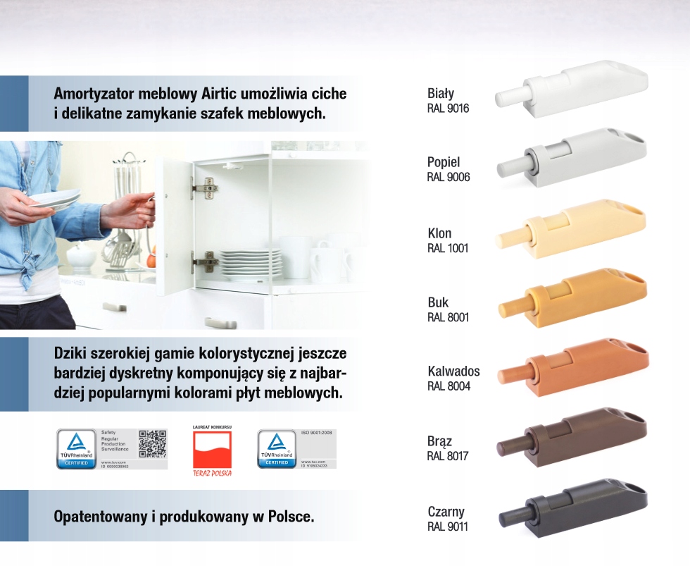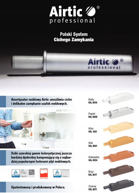 Тихе та обережне закривання меблевих шаф завдяки Airtic. Airtic - відмінний меблевий амортизатор, виробництва Польщі. Це продукт, захищений численними патентами. Його пневматична конструкція дозволяє безшумно і плавно закривати меблеві шафи. Його можна за кілька секунд встановити будь-де на меблі. Завдяки діаметру 8 мм, він непомітний і в той же час надзвичайно корисний. Дозволяє ефективно гальмувати всі меблеві фасади, в тому числі з підйомною кришкою. Спробуйте Airtic, і ви побачите, наскільки зручними можуть бути меблі, що закриваються.