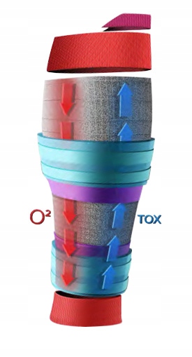 Точне поступове стиснення, яке доставляє більше кисню до м’язів. Підвищує продуктивність м'язів і прискорює регенерацію. Кисневі вентиляційні панелі, які використовуються на гомілках, забезпечують максимальну вентиляцію та відчуття легкості та свіжості.