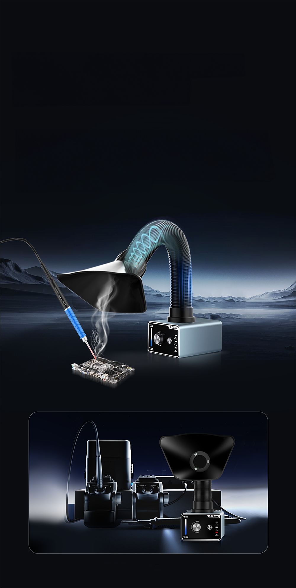 Димовідсмоктувач AiXun — це передовий пристрій, розроблений для точного ремонту паяння, що забезпечує чисте та безпечне робоче середовище. Завдяки сучасним технологіям, надійній конструкції та інтуїтивно зрозумілому керуванню, аспіратор AiXun виправдає очікування навіть найвимогливіших користувачів. Система фільтрації з активованим вугіллям і HEPA ефективно видаляє випари, пил і неприємні запахи, забезпечуючи комфорт під час роботи. Інтелектуальні функції, такі як голосове керування та автоматичний запуск, підвищують ефективність і зручність використання. Міцний алюмінієвий корпус гарантує довговічність і естетичний вигляд.