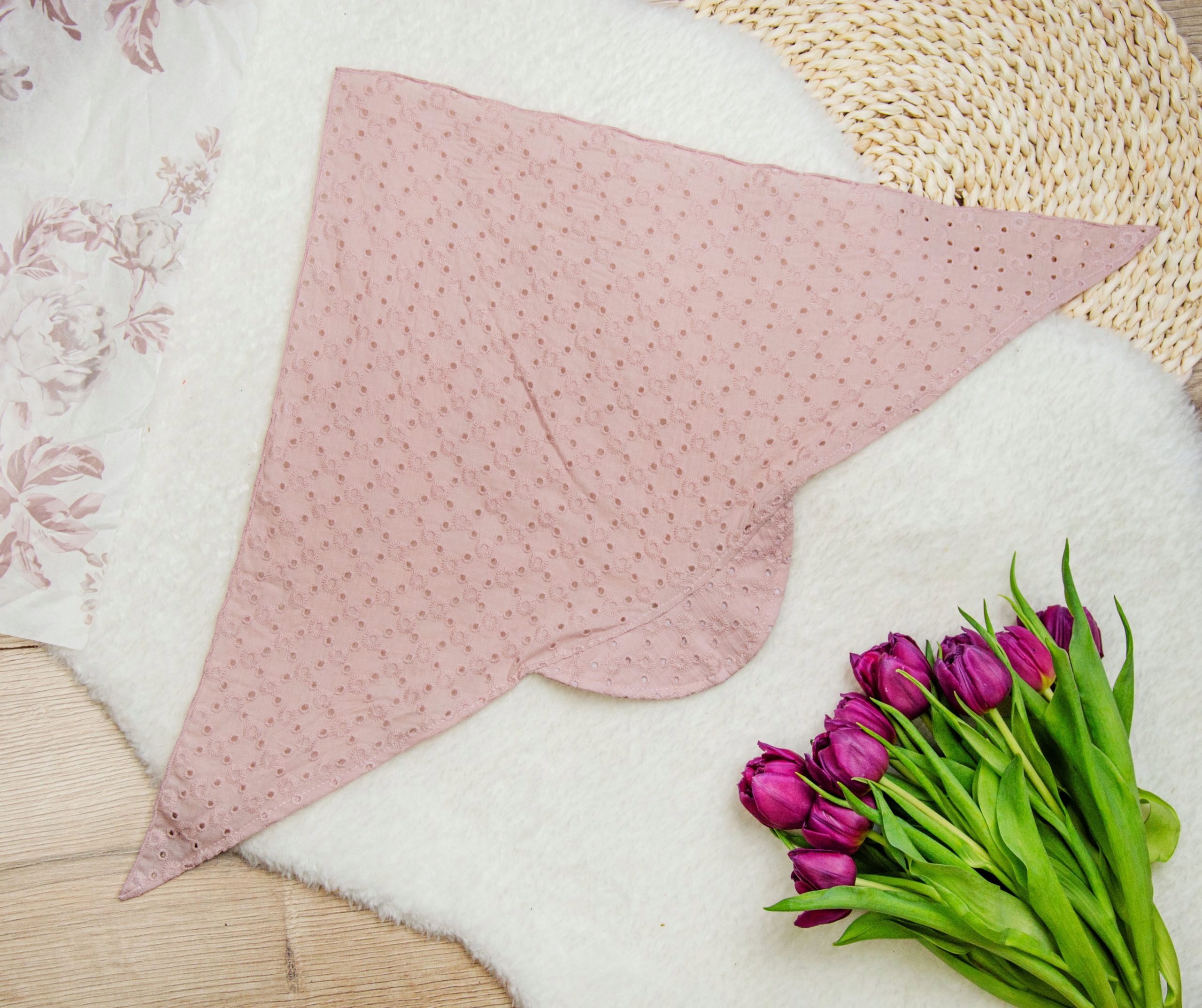 Зручний шарф для самих маленьких з повітряної ажурної тканини пудрово-рожевого кольору.