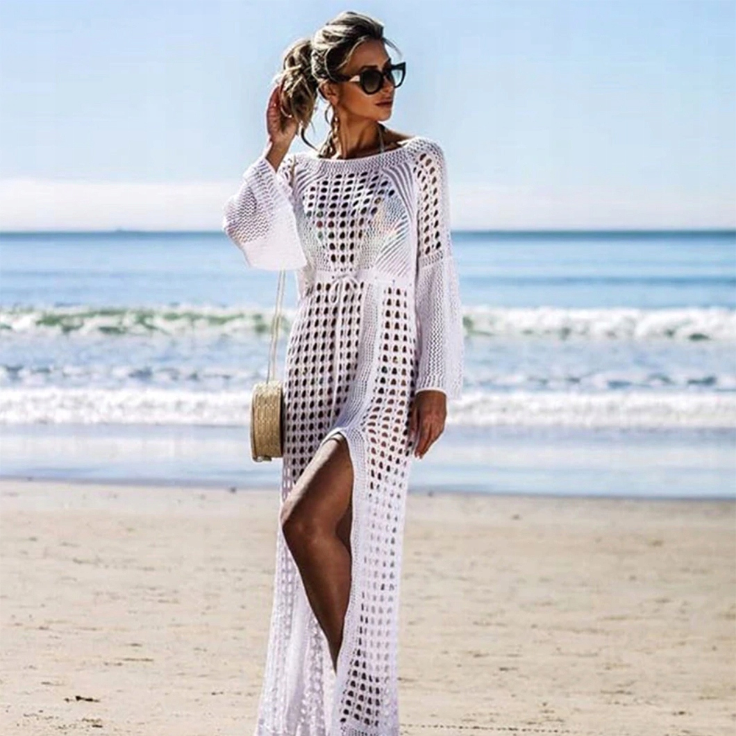 Вільне літнє плаття, виконане з м'якого матеріалу з ажурним візерунком. Має ефектний розріз внизу та довгі розкльошені рукави. Шнурок на талії забезпечує ідеальну посадку.