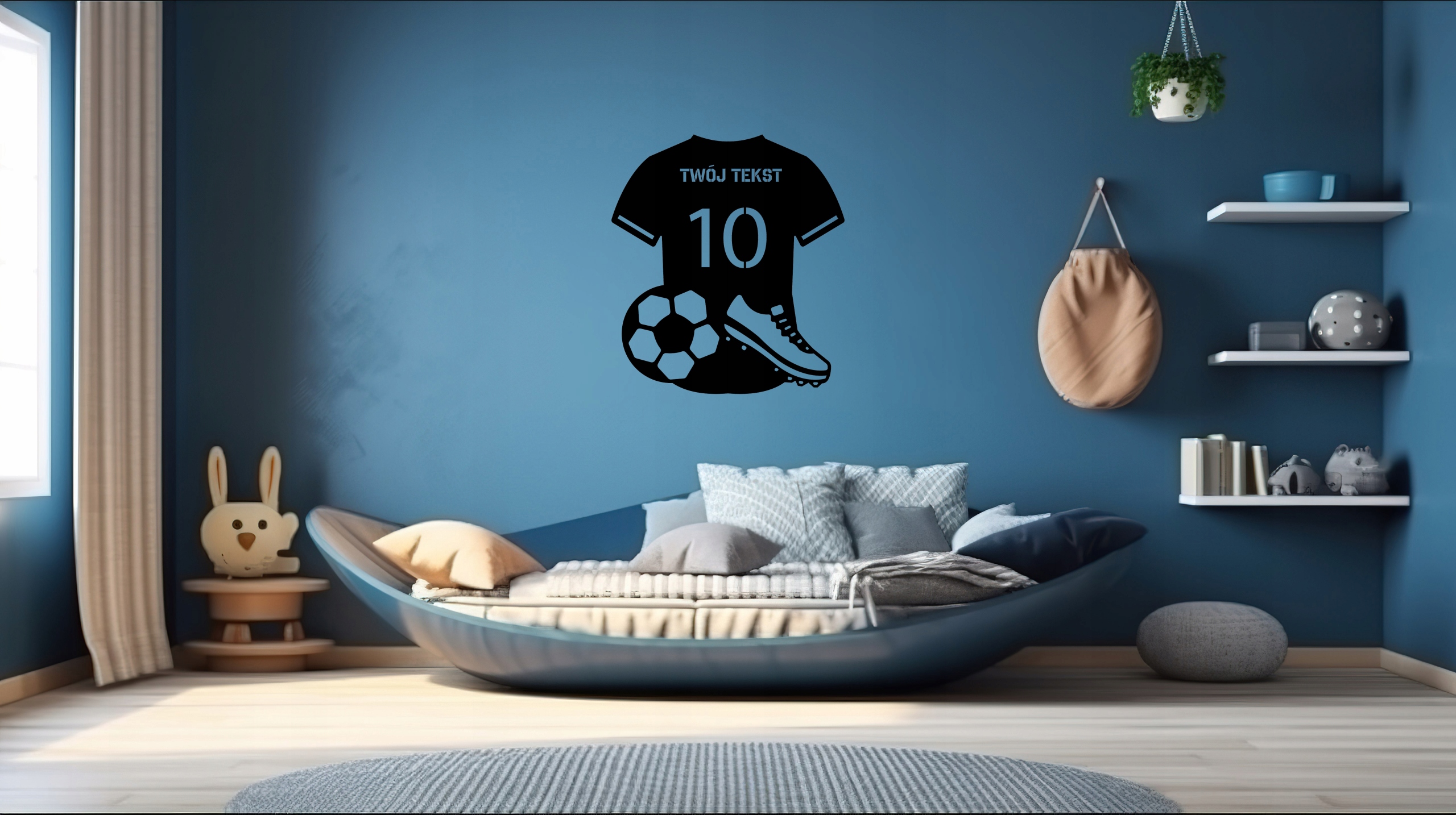 Ажурне зображення - футболка з іменні назвою, ідеальний подарунок для маленького футбольного фаната! Завдяки легкому монтажу за допомогою двостороннього скотча повісити його на стіну буде просто і швидко, без необхідності свердління отворів. Персоналізація імені додає унікальний характер, роблячи цю футболку унікальною. Це ідеальний спосіб прикрасити кімнату юного вболівальника та оригінально підкреслити його пристрасть до футболу