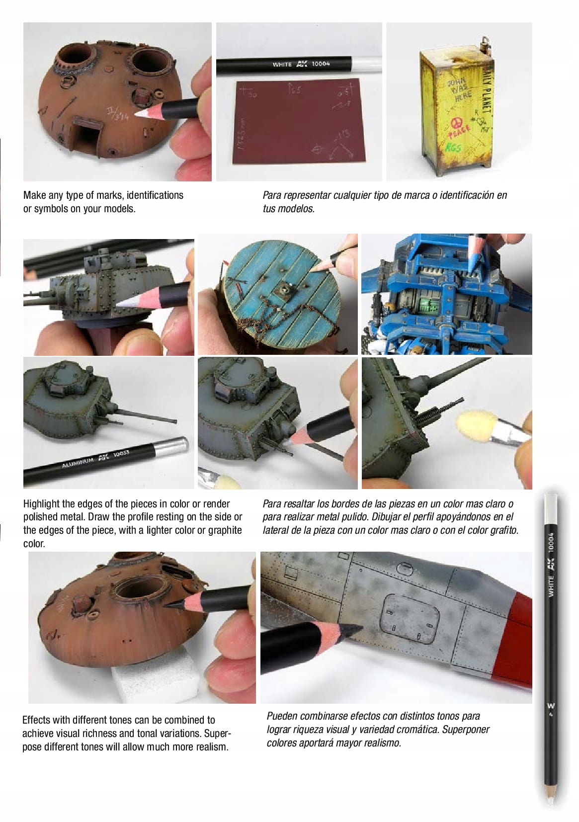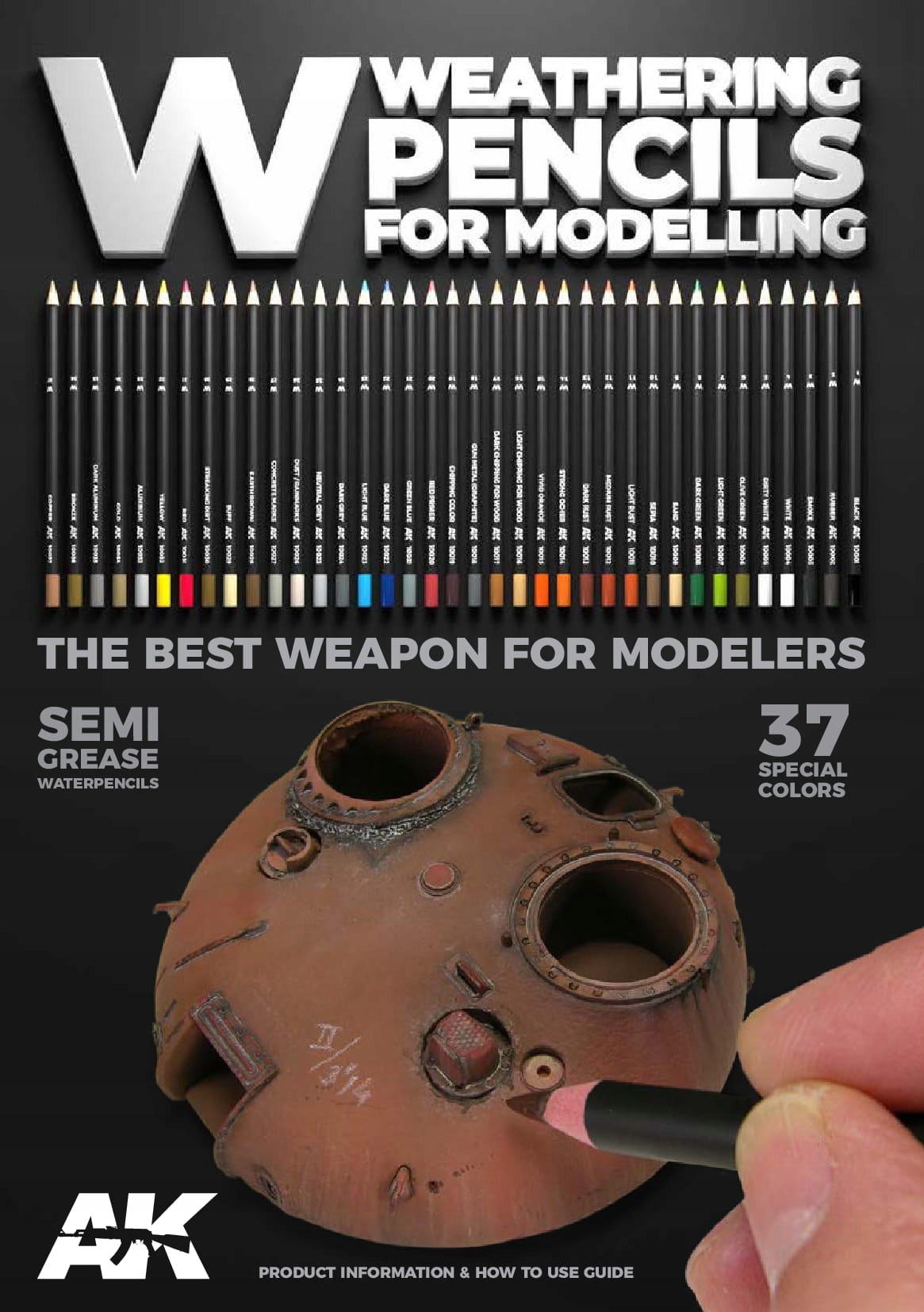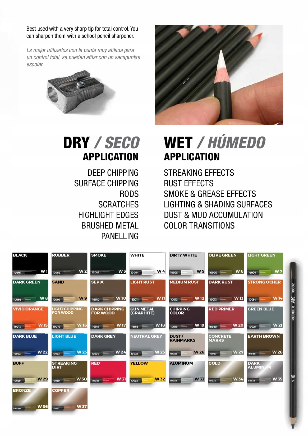 Водні олівці з фарбою — це простий і точний спосіб створення різноманітних ефектів вивітрювання; можна наносити сухим способом; залежно від ваших потреб, ви можете виправити та розмити ефект на поверхні моделі, помивши її щіткою, змоченою водою. Для досягнення найкращих результатів виробник рекомендує наносити його на матові поверхні.