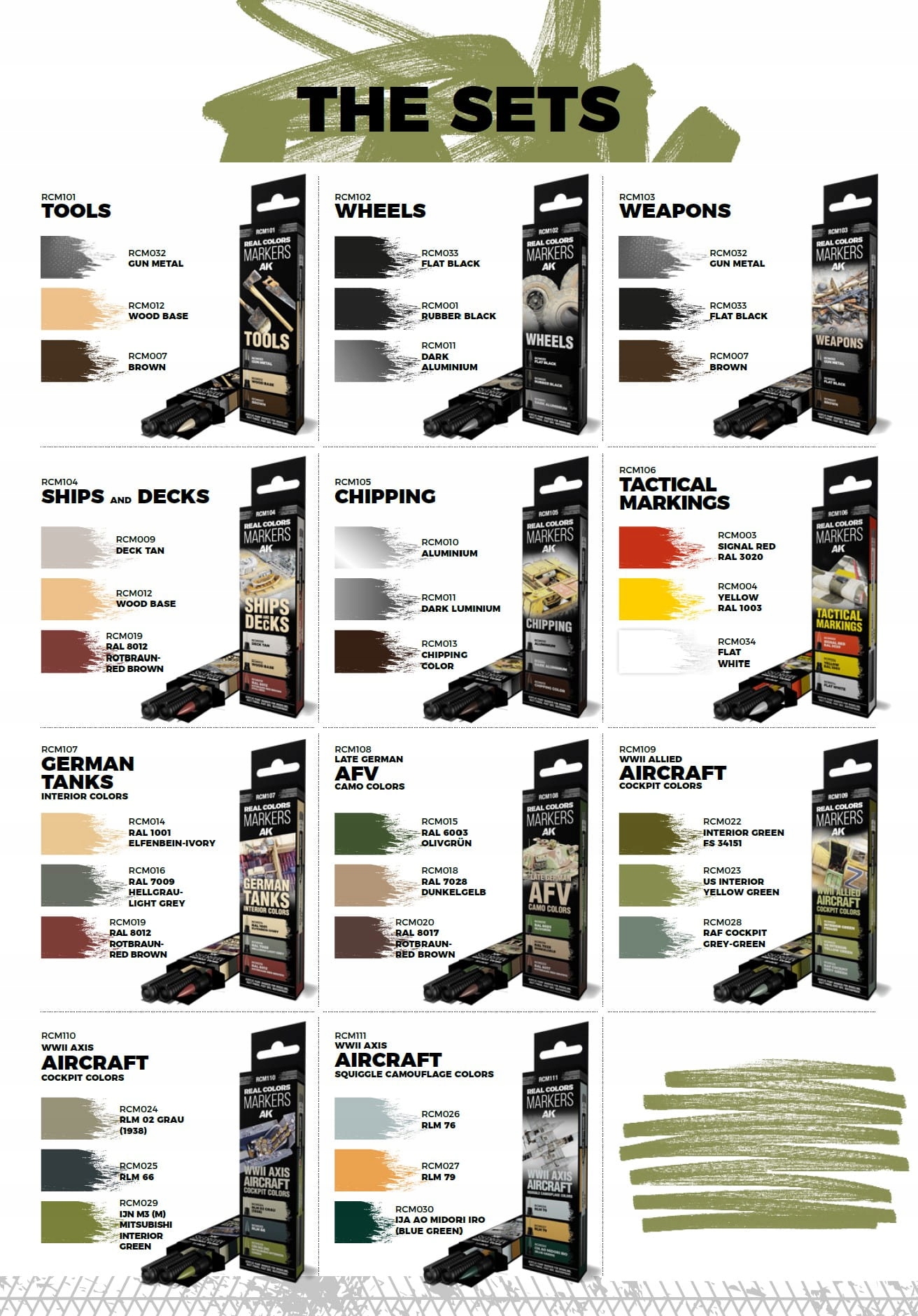 Маркери AK Interactive Real Colors доступні в 34 кольорах як окремі маркери, так і в наборах.