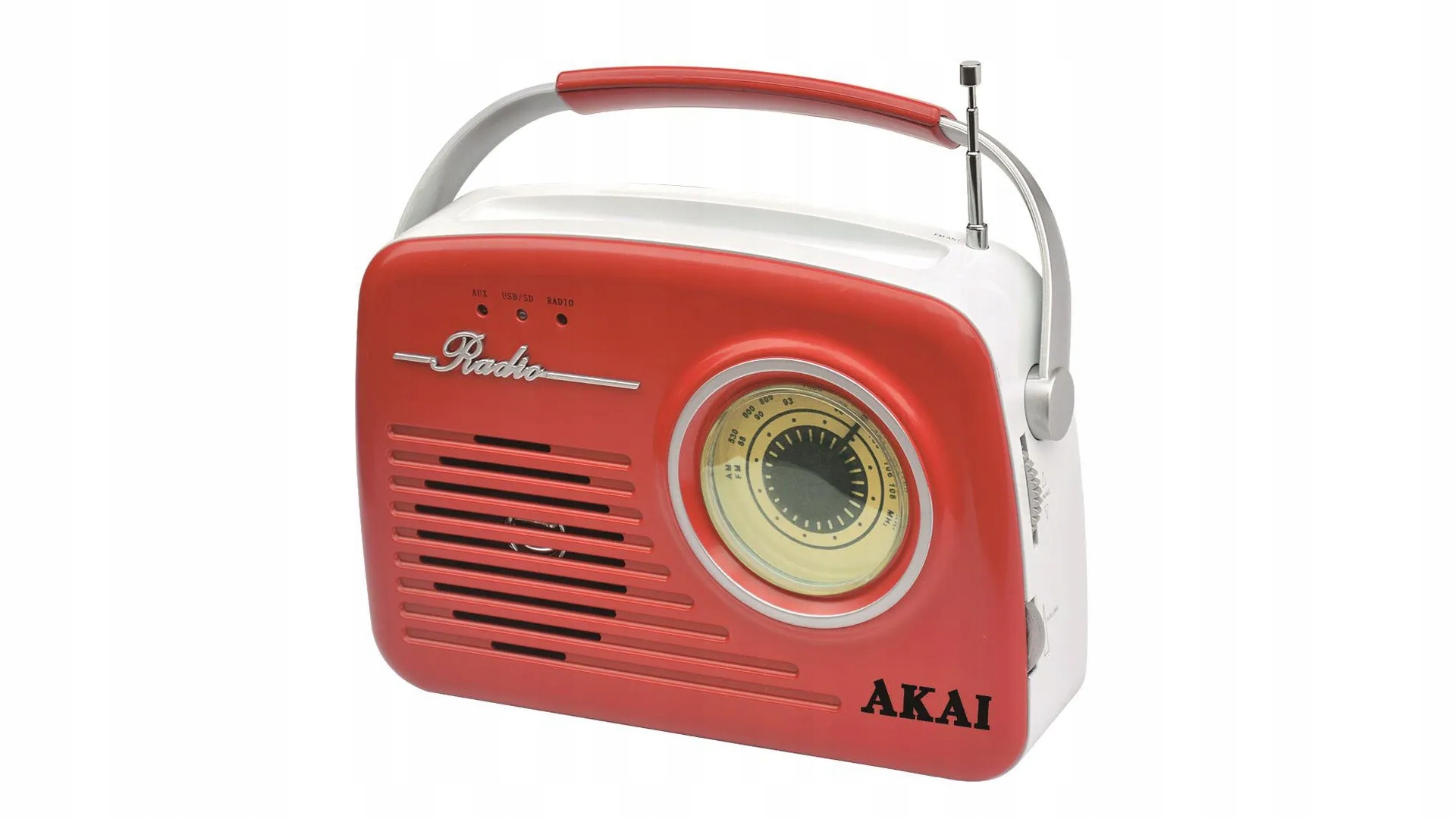 Портативне радіо з USB, пристроєм для читання SD-карт, входом AUX, роз’ємом для навушників і ретро-дизайном червоного кольору.