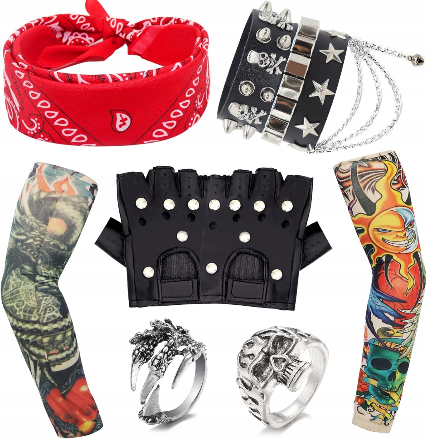 ✅ Набір містить 2 обкладинки для рукавів з помилковою татуюванням, 1 червоною піратською банданою, 2 шкіряними рукавичками, 2 браслетами та 2 кілець у вінтажному стилі. Ідеально підходить для косплей, тематичних подій та кожної можливості, яка вимагає рок -стилю.