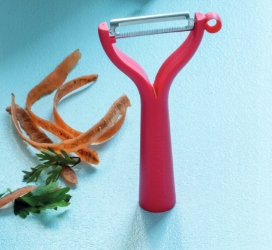 Покращений очисник для овочів і фруктів із подвійним лезом. Зубчаста частина ножа дозволяє легко очищати овочі та фрукти з м’якою шкіркою, наприклад, помідори, перець, сливи, ківі, баклажани. Ми використовуємо традиційне лезо для чищення моркви, буряка чи картоплі.