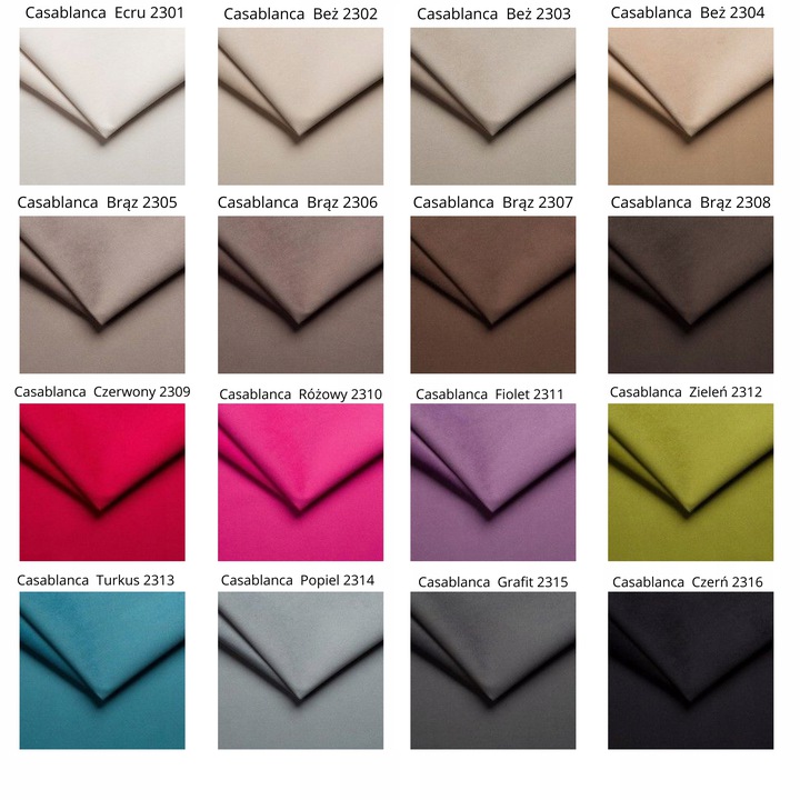 Касабланка — це м’яка оксамитова тканина, структура якої нагадує плюш. Зовнішнє міліметрове покриття змушує матеріал злегка мерехтіти під час використання. Чудово виглядає на меблях з прострочкою або стьобанням. Крім того, Касабланку покрили захисним шаром «Cleanaboo» і виготовили в новій якості. Завдяки цьому матеріал довгий час залишатиметься як новий, а Ви зможете насолоджуватися гарним, доглянутим предметом меблів.