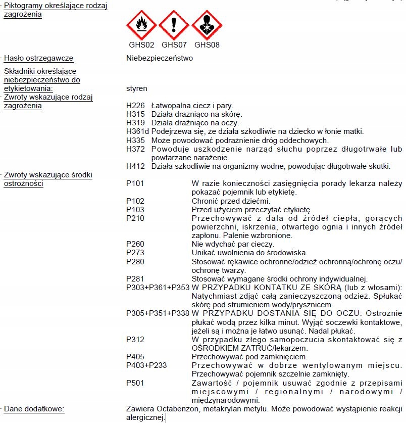 Займиста рідина та пари. Є підозри, що він має шкідливий вплив на ненароджену дитину. Спричиняє пошкодження слуху через тривалий або повторний вплив. Це подразнює шкіру. Викликає серйозне подразнення очей. Може викликати шкірну алергічну реакцію. Може викликати подразнення дихальних шляхів. Шкідливий для водних організмів з довготривалими наслідками. Тримайте подалі від тепла, гарячих поверхонь, іскор, відкритого вогню та інших джерел займання. КУРИТИ ЗАБОРОНЕНО. Не вдихати пари. Уникати потрапляння в навколишнє середовище. Одягайте захисні рукавички/захисний одяг/захист очей/захист обличчя. ПРИ ПОТРАПЛЯННІ НА ШКІРУ (або волосся): Негайно зніміть весь забруднений одяг. Промити шкіру водою [або прийняти душ]. ПРИ ПОПАДАННІ В ОЧІ: Обережно промийте водою протягом кількох хвилин. Зніміть контактні лінзи, якщо вони носяться і їх можна легко зняти. Продовжуйте полоскання. Зателефонуйте в ТОКСИКОЛОГІЧНИЙ ЦЕНТР/до лікаря, якщо ви почуваєтеся погано. У разі подразнення шкіри або висипу: Зверніться до лікаря. Зберігати в добре провітрюваному місці. Зберігати контейнер щільно закритим. Зберігати під замком. Утилізуйте вміст/контейнер відповідно до місцевих/регіональних/національних/міжнародних правил. Продукт містить: стирол, 1,1,1-триметилолпропантрі(3-меркаптопропіонат), метилметакрилат, октабензон, етоксильований пропілідитриетанол, ефір акрилової кислоти (<6,5 моль ЕО), 2-пропенову кислоту, 2-метил-2-гідроксіетиловий ефір, продукт реакції з оксидом фосфору.