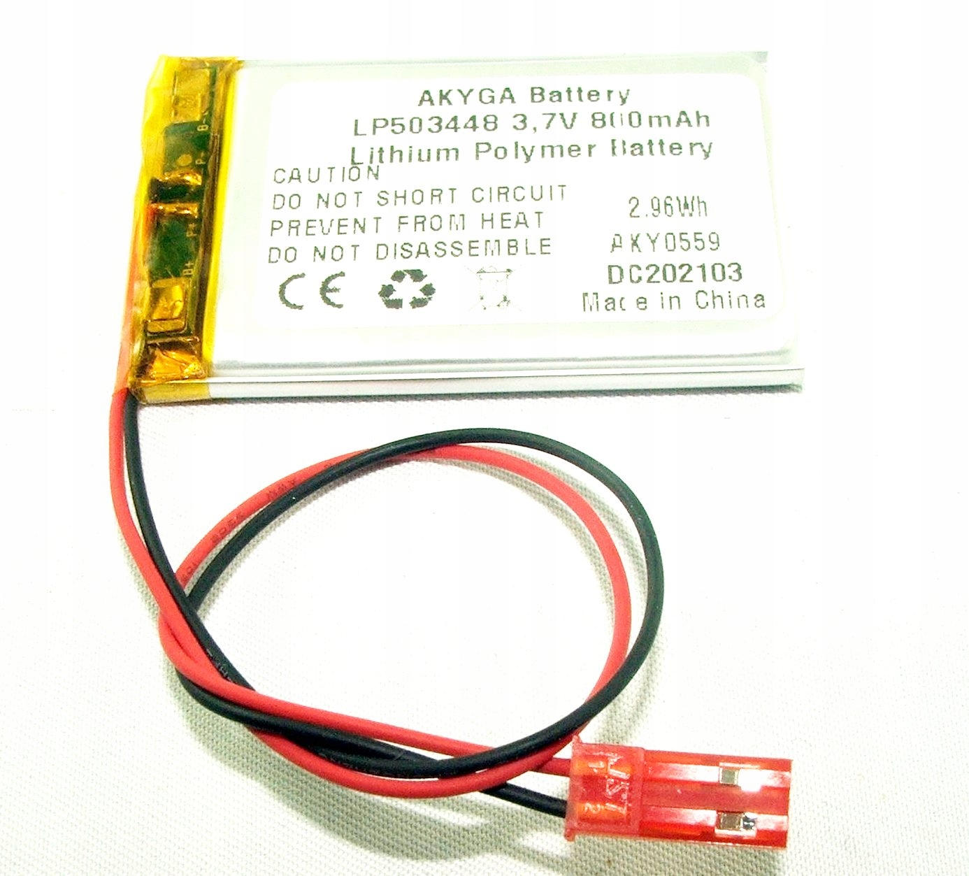 Літій-полімерний акумулятор із системою захисту та роз’ємом - Високий ККД по струму - Відсутність ефекту пам'яті - Хороше співвідношення місткості до розмірів і ваги камери - Велика гнучкість у проектуванні форм і розмірів. - Високоякісні системи захисту, які контролюють процеси зарядки та розрядки Легко збирається завдяки клемникам у вигляді проводів і спеціальному роз'єму Без електролітів, вуглецевих матеріалів. Екологічно чисті акумулятори Повільна швидкість спонтанного розряду клітин додаток, серед інших в портативних пристроях: цифрових камерах і відеокамерах, КПК, мобільні телефони, мультимедійні плеєри. Використовується як джерело живлення в моделюванні, наприклад, дистанційно керованих літаків і гелікоптерів. Дуже популярний в логістиці, системах GPS і медицині Корпус 50,5 мм X 35 мм X 5,5 мм