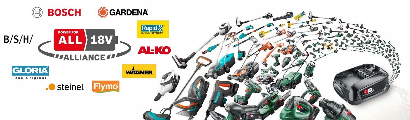 Bosch Home and Garden Compatible — це найбільша багатобрендова акумуляторна система 18 В від провідних виробників, також відома як POWER FOR ALL ALLIANCE 18V. Система включає акумуляторні пристрої на 18 В таких брендів, як BOSCH, GARDENA, GLORIA, WAGNER, RAPID, STEINEL, FLYMO та AL-KO.