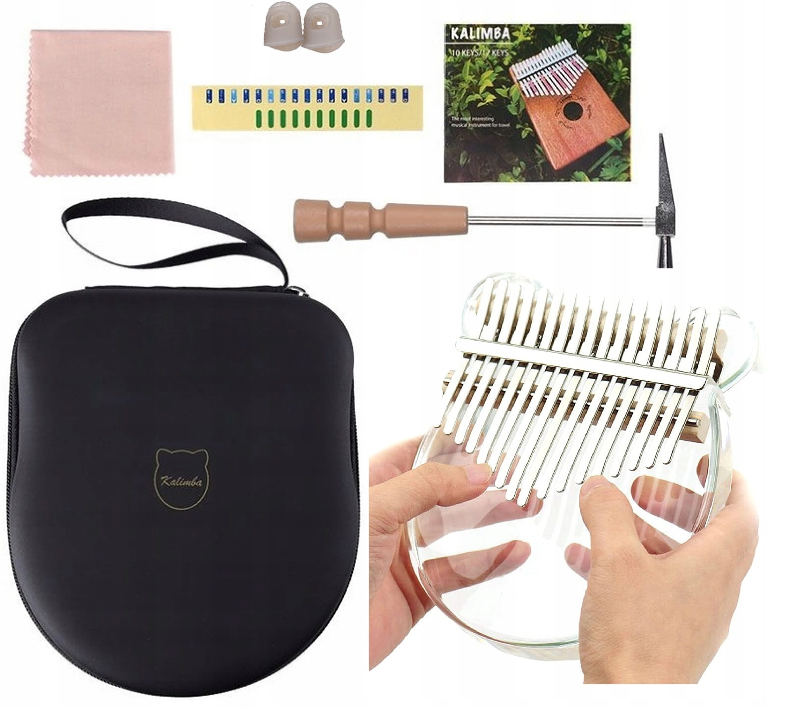 - Вміст набору: калімба, жорсткий футляр, тюнінговий молоток, наклейки, підручник, гумові чохли для великих пальців, тканина.