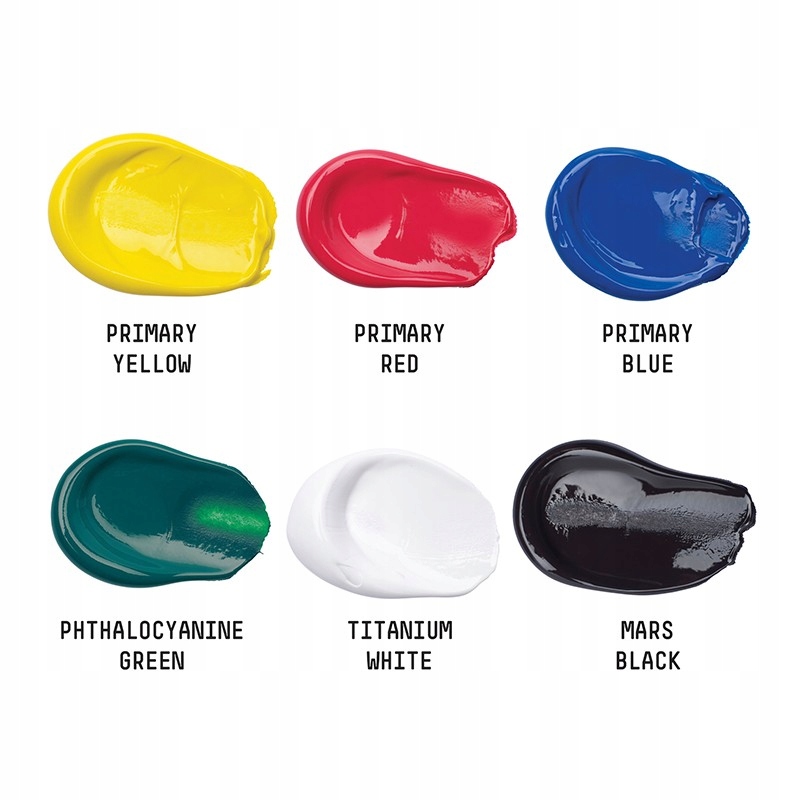 Включені кольори: первинний жовтий, первинний червоний, первинний синій, фталоціаніновий зелений, титановий білий, марсіанський чорний.