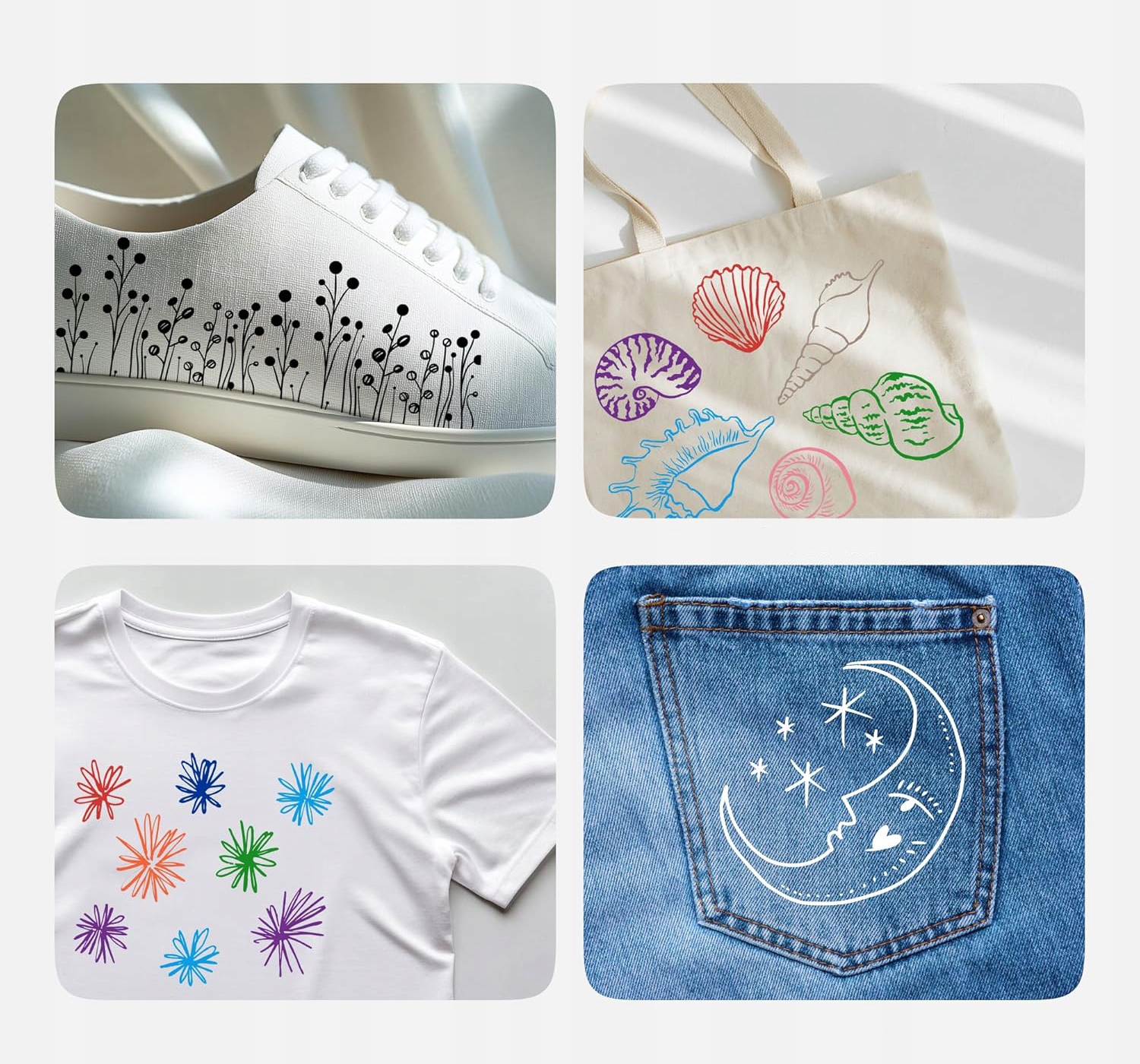 - Тканини та одяг: Персоналізуйте футболки, сумки, взуття (після кріплення), подушки.