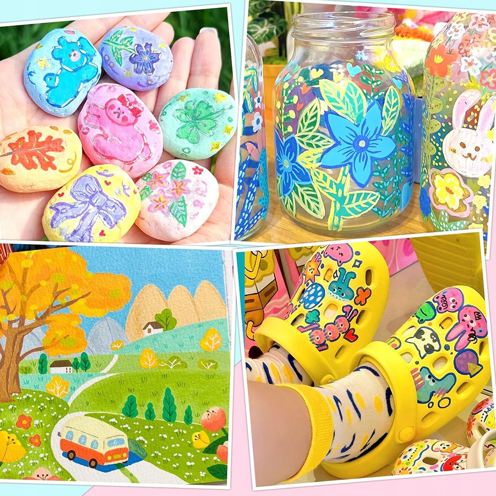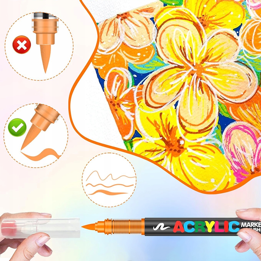 Водостійкі акрилові маркери: акрилові маркери та багатоцільові ручки пропонують виняткову універсальність. Завдяки тонким широким кінчикам пензля ви можете малювати практично на будь-якій твердій поверхні - від тканини, кераміки до дерева, металу, скла і навіть шин. Ідеально підходить для творчих проектів, рукоділля та професійного використання.