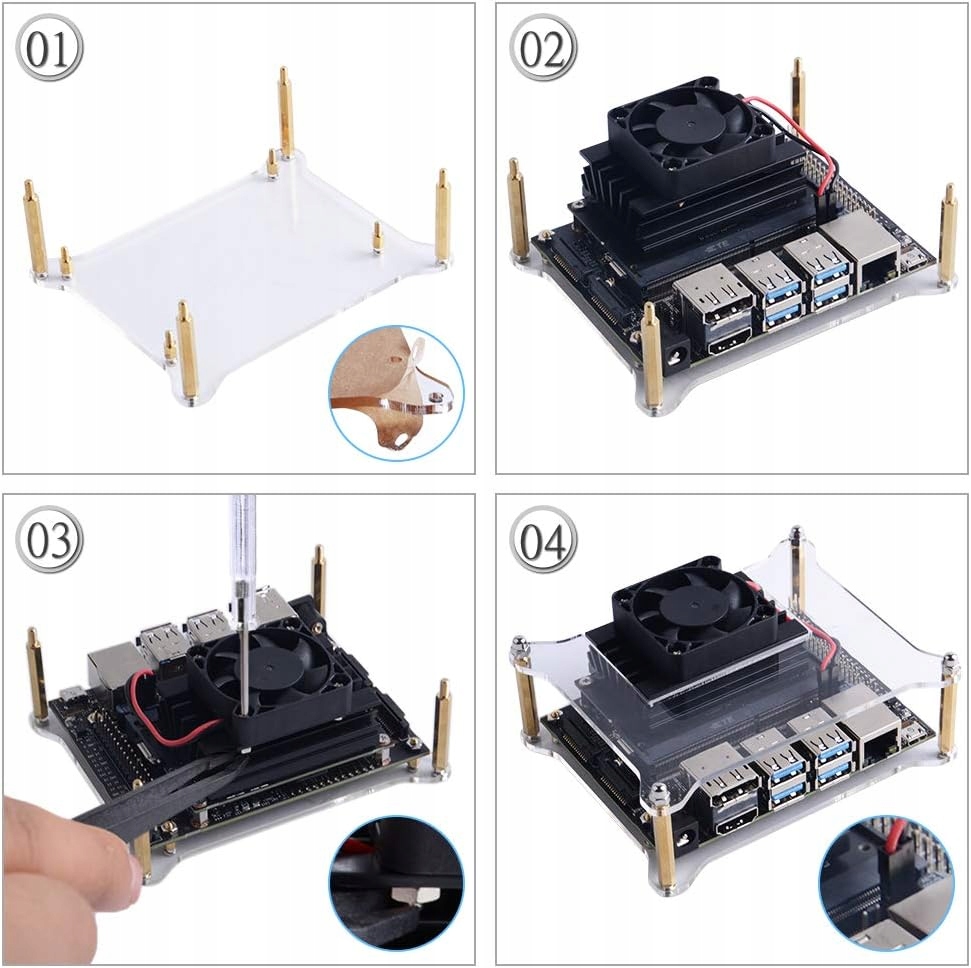 - Високоякісний акриловий футляр із вентилятором захищає Jetson Nano.
