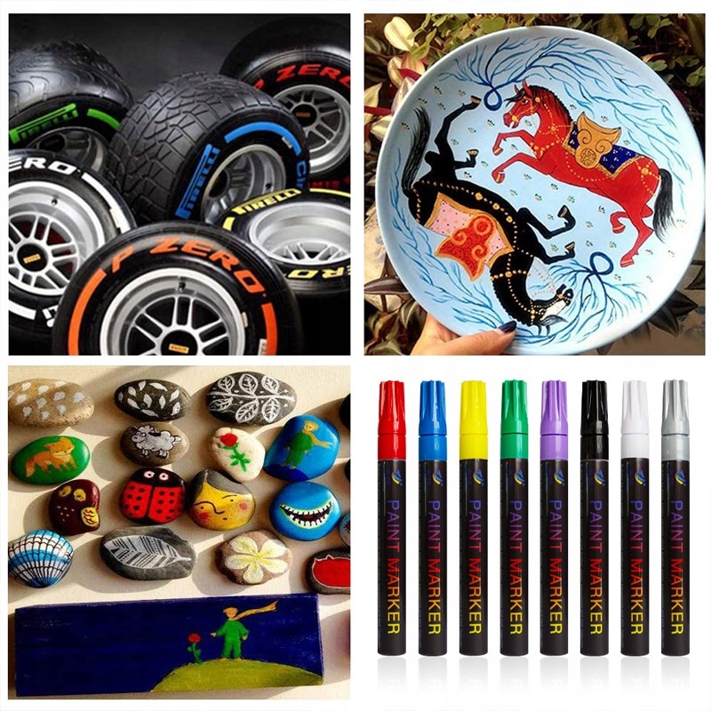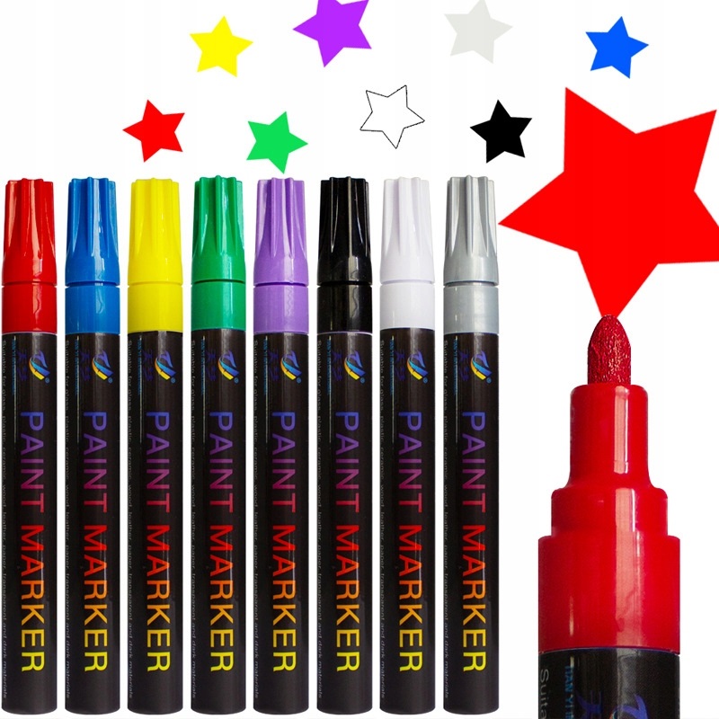 ⭐ підходить для написання та малювання на будь -якій поверхні: папір, тканина, пластик, теракота, скло, порцеляна, метал, дерево і навіть на тілі. Він стійкий до світлих та погодних умов, а кольори туші не змішуються один з одним після висихання. Фарба -плакат, що міститься в маркері, гладка, рідка і характеризується дуже високою інтенсивністю кольору та покриттям.
