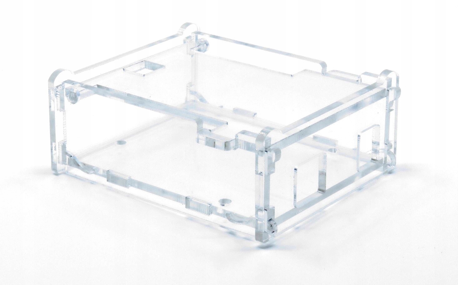 Корпус, сумісний з Arduino Uno. Виготовлена з прозорого пластику і закрита з усіх боків. Він має кришку, що відкривається вгорі, і вирізи для всіх роз’ємів на платі. Для складання не потрібні додаткові інструменти та шурупи – збирається за допомогою засувок і отворів в елементах корпусу.