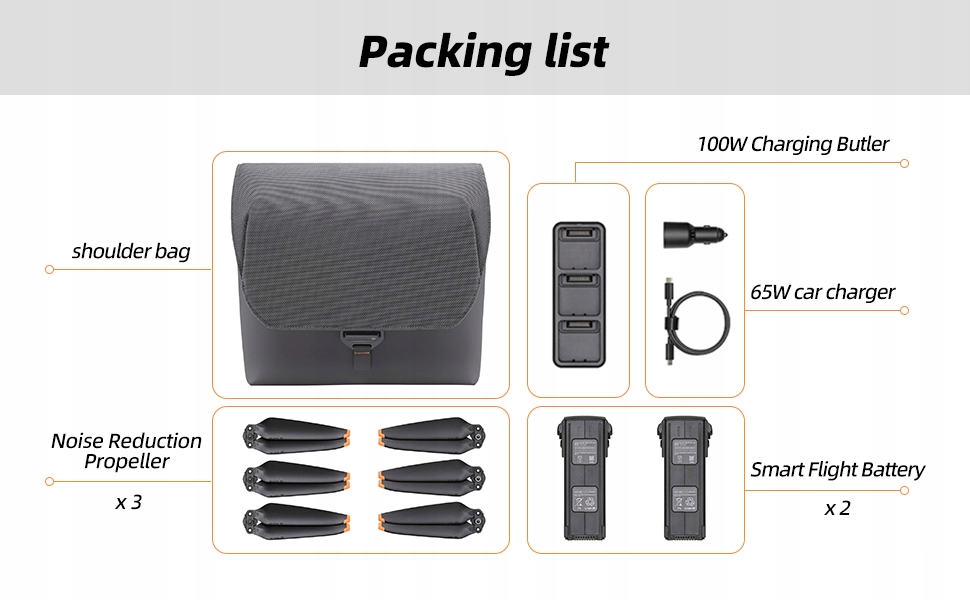 - Що ви отримаєте]: 3×2 батареї Mavic, зарядний пристрій на 100 Вт×1, автомобільний зарядний пристрій на 65 Вт×1, малошумні пропелери (пара)×3, наплічна сумка×1 /li>