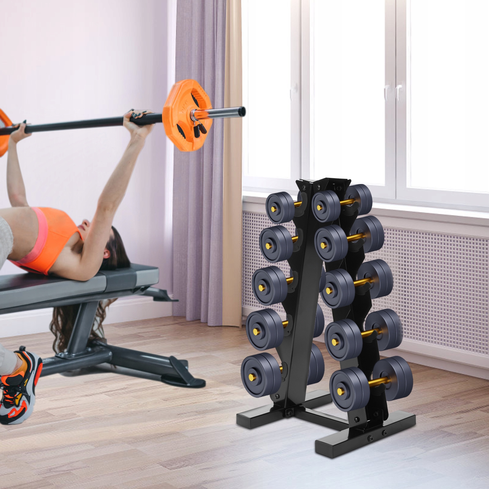 Підходить для зберігання гантелей у будинках, готелях, спортзалах, школах, на змаганнях з важкої атлетики тощо, і призначений для зберігання різних типів гантелей, включаючи шестикутні, гумові шестикутні та неопренові гантелі.
