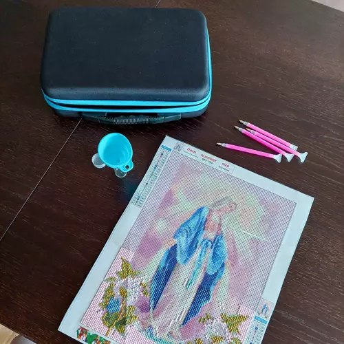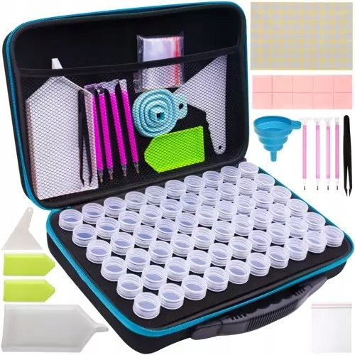 - ПРАКТИЧНИЙ ФУНКЦІЙ З РУЧКОЮ - аксесуари для алмазної вишивки - ідеальний спосіб підтримувати порядок під час гри з вишивкою. Все було запаковано в жорсткий футляр, як у валізу. Банки для діамантів розміщені в спеціальному молдингу, а для решти аксесуарів є кишеня. Додатково в чохлі є зручна ручка, яка полегшує перенесення набору.