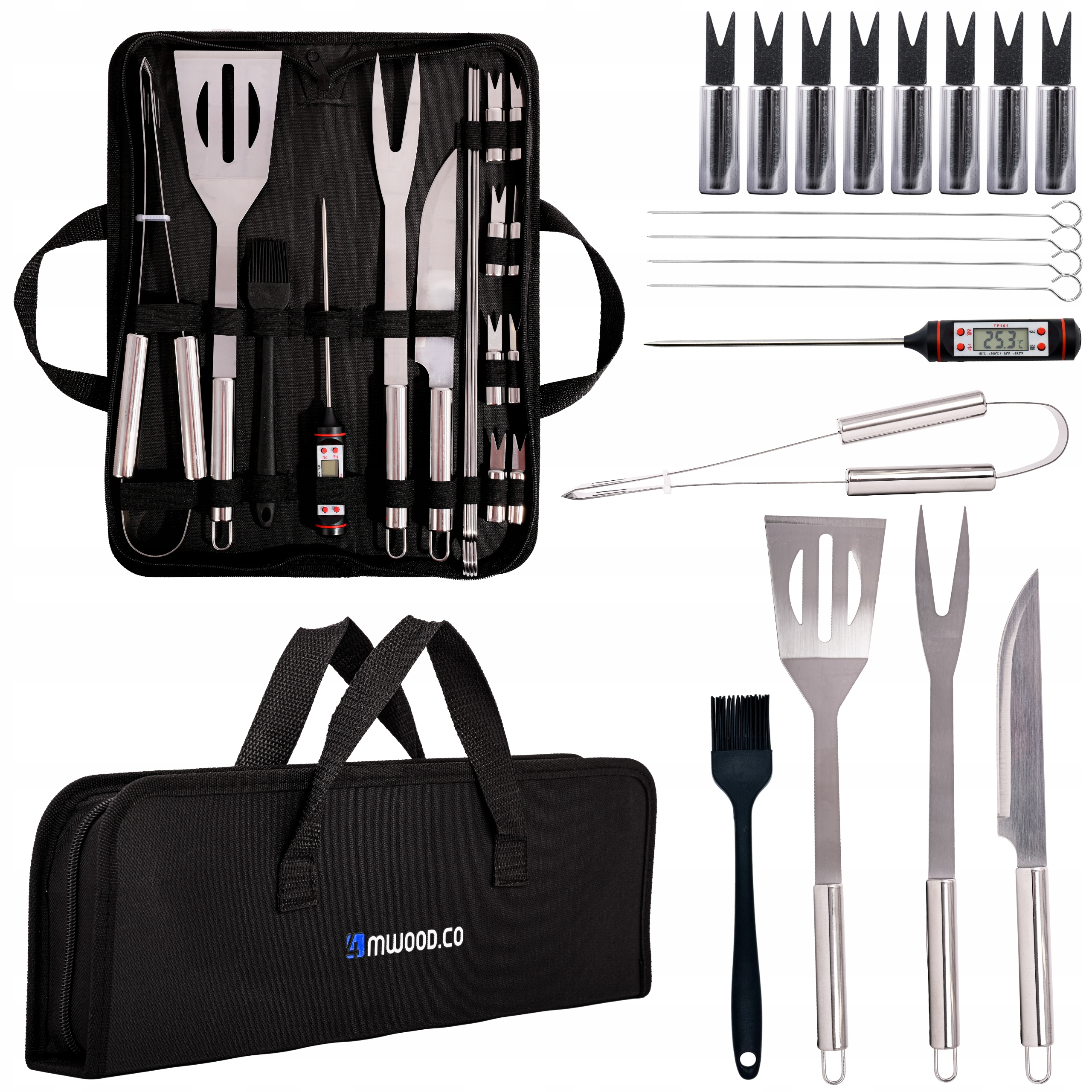 Набір з 18 інструментів для барбекю, виготовлених з найвищої якості нержавіючої сталі, ідеально підходить для ентузіастів на грилі. Повний набір включає все, що вам потрібно, щоб створити чудову страву на грилі.