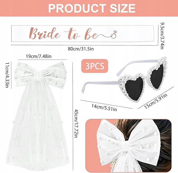 - У комплекті: біла фата з великим бантом, білий пояс із написом Bride to Be у золоті, окуляри