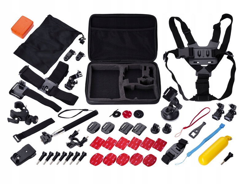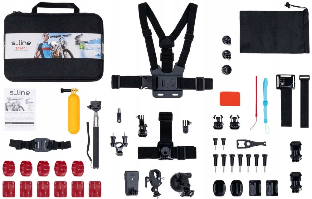 You will find in it: monopod , which is the simplest type of tripod, adapter with a 1/4 tripod attachment ", fast connections , which will help you quickly attach the camera in supports and handles, chest fastening attaching the camera on the head, hand band , hand strap to the Дистанційне управління дистанційне керування, губка переміщення , застібки для захисту з фіксаційною стрічкою, плоский кріплення , а також коротке сформульоване розширення , плоский кріплення , переміщення Swimer , що захистить камеру від покину, b мішок для аксесуарів , ручка труби , велосипедна ручка вигнута кріплення приклеєна до шолома.