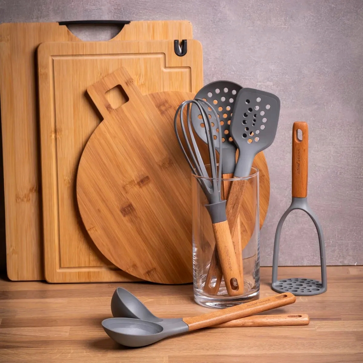 Поєднання сучасного PBT матеріалу з натуральним деревом надає посуду привабливого зовнішнього вигляду, який підходить до різних стилів кухні.