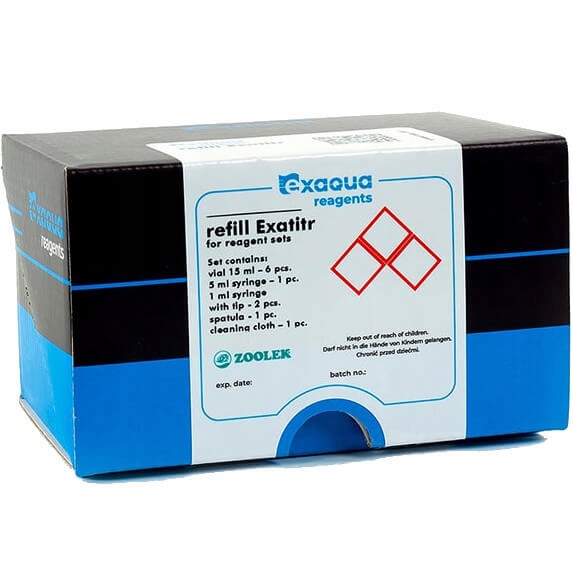 Набір Refill Exatitr — це набір оригінальних аксесуарів, які використовуються для тестування води за допомогою фотометрів Exaqua. Його можна використовувати як для Exaqua PRO3, так і для Exaqua PRO6. Він включає в себе всі аксесуари, необхідні для проведення аналізів води на основі аналітичного методу титрування. Титрування передбачає додавання розчину, який називається титрант, до досліджуваного зразка, поки суміш помітно не змінить колір. Потім зчитується витрата титранта та обчислюється значення, що представляє інтерес. В акваріумах цей метод використовується для перевірки трьох параметрів: загальної жорсткості GH, вмісту кальцію Ca та концентрації магнію Mg у воді. Набір Refill Exatitr дозволяє продовжувати використовувати тести, якщо аксесуари, які спочатку входили в пакет тестів GH, Ca та Mg, пошкоджені або втрачені. Це особливо важливо у випадку зі скляними флаконами, які через матеріал, використаний для їх виготовлення, є крихкими та делікатними та можуть легко розбити. Пластикові шприци з часом втрачають свою герметичність, що робить збір реагенту неточним, а результати ненадійними. Тому їх слід замінити на нові.