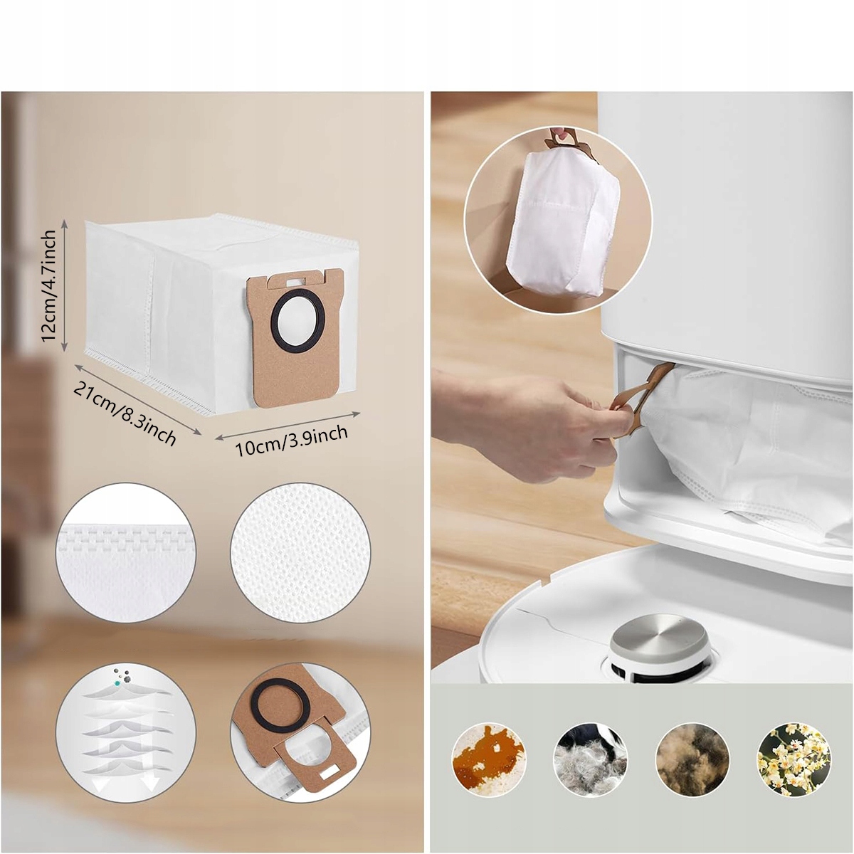 Виготовлений із високоякісного волокнистого фільтруючого шару та нетканого полотна, ефективно фільтрує 99,95% забруднюючих речовин. Велика ємність дозволяє вловлювати забруднення, волосся та пил, роблячи підлогу чистою, як нову. 3-літровий одноразовий мішок для пилу зберігає пил, бруд і шерсть домашніх тварин до 8 тижнів і полегшує очищення.