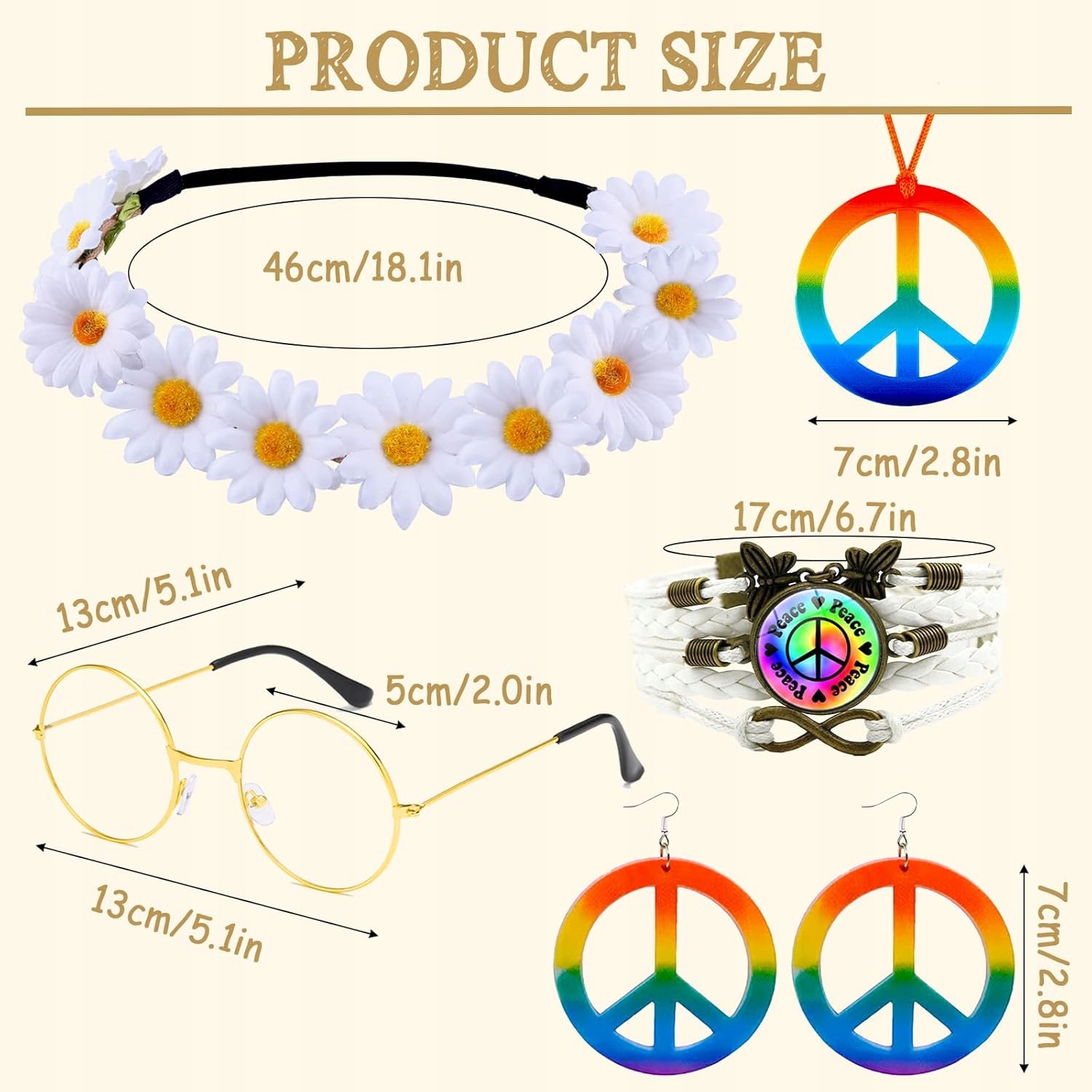 ✅ Ви отримаєте набір аксесуарів хіпі для жінок, включаючи: 1 пов’язку з ромашками, 1 пару круглих окулярів, 1 ланцюжок на шию, 1 пару сережок у стилі миру та 1 браслет. Модний і вишуканий, ідеально підходить для створення різноманітних стилів і насолоди образом хіпі.