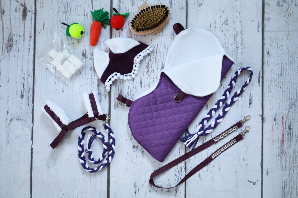 Запрошуємо Вас відкрити для себе унікальний набір аксесуари фіолетового та білого кольорів, створені спеціально для любителів верхової їзди. Кожен елемент цього комплекту був ретельно підібраний з точки зору кольору, створюючи цілісне та гармонійне ціле, яке не тільки чудово виглядає, але й робить кожну мить, проведену з улюбленим конем, унікальною.