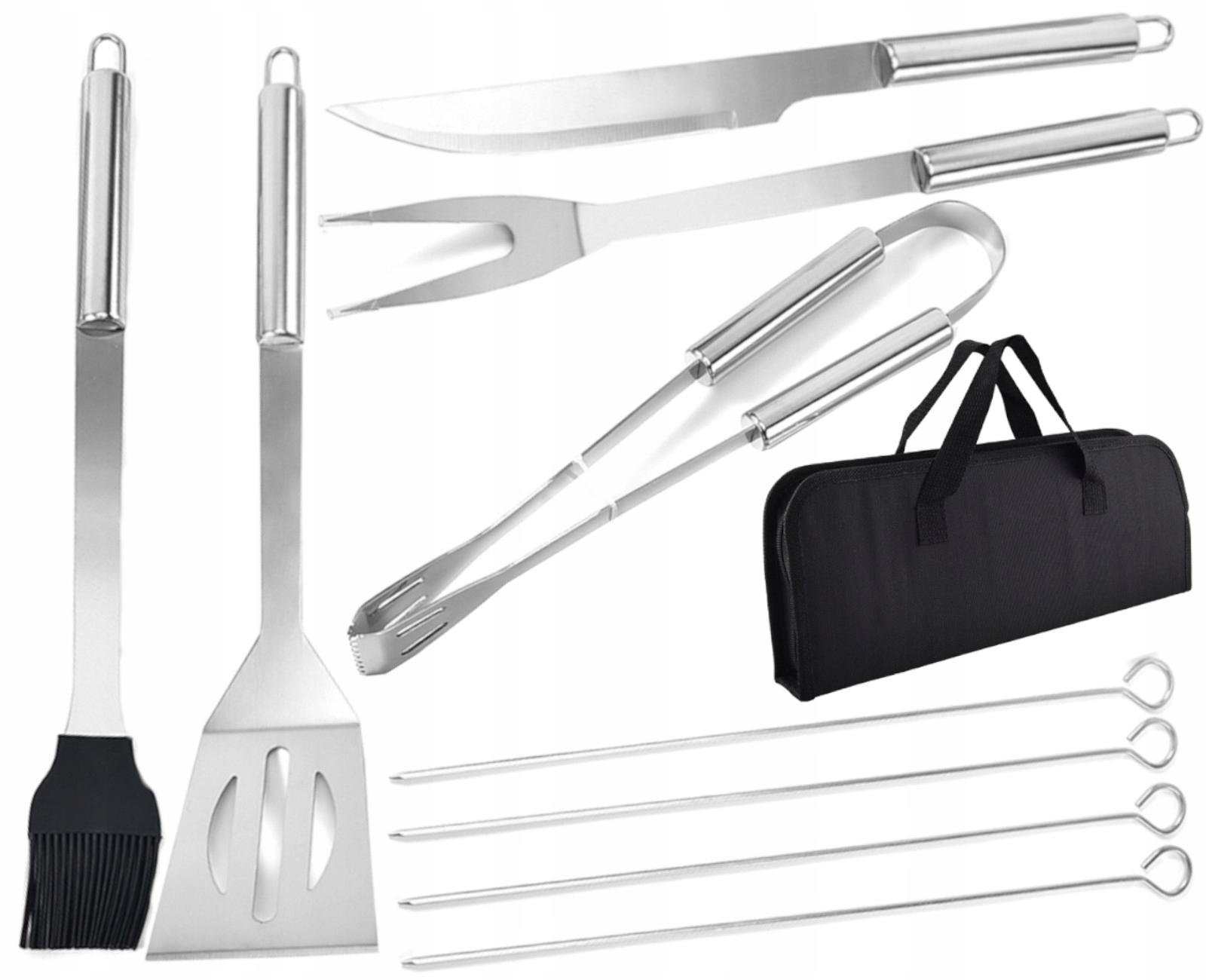- Набір з 9 універсальних гриль -приладів, виготовлених з твердої нержавіючої сталі. Ідеальний гаджет для всіх любителів грилю. Усі елементи стійкі до високої температури та прості в очищенні. Аксесуари також ідеально підходять для домашньої кухні. Довгі ручки дозволяють зручне обертання страв без ризику опіків. Спеціальний випадок з ручкою в наборі, що полегшує його передачу.