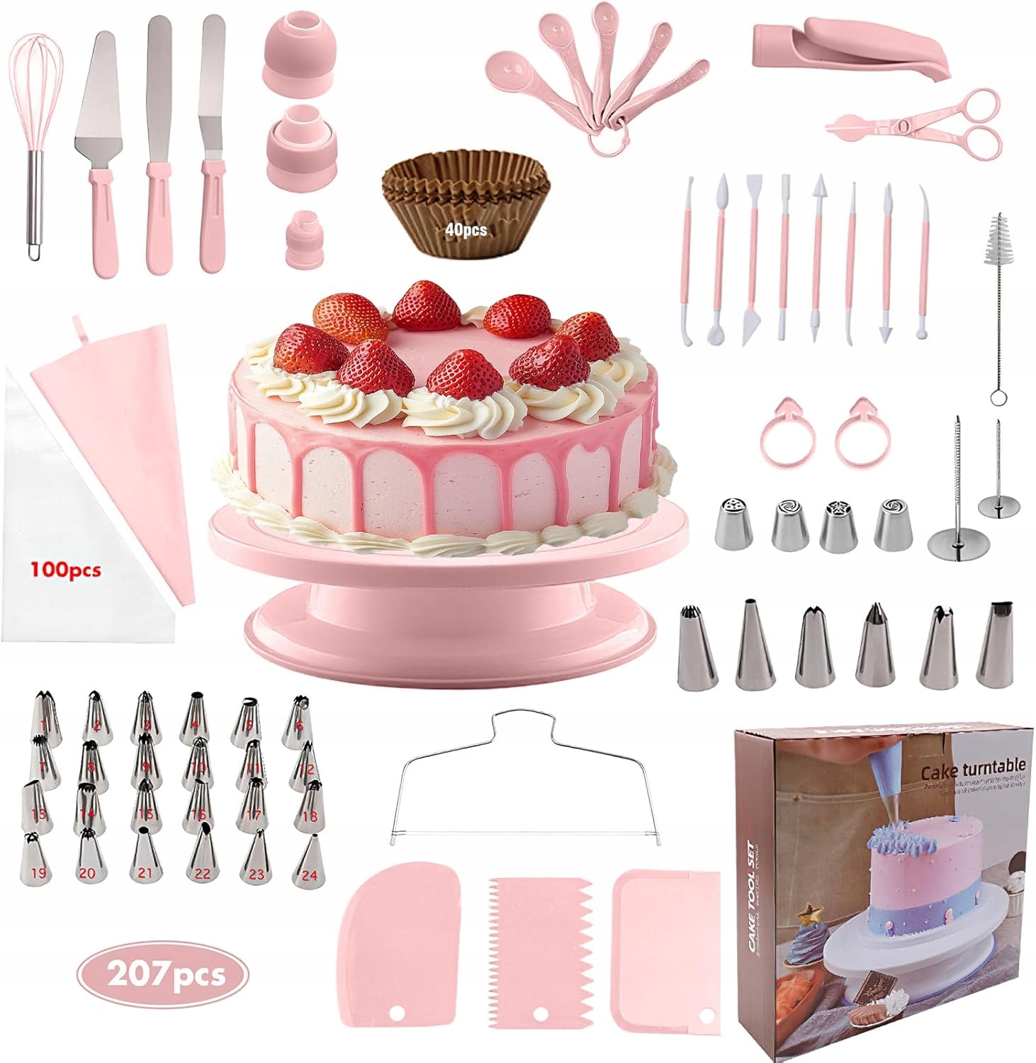 У набір входять усі необхідні інструменти для випікання та декорування тортів - обертовий стіл, лопатки, кондитерські мішки, декоративні наконечники, форми, ножиці та багато іншого. Це ідеальний набір для кожного ентузіаста кондитерської справи.