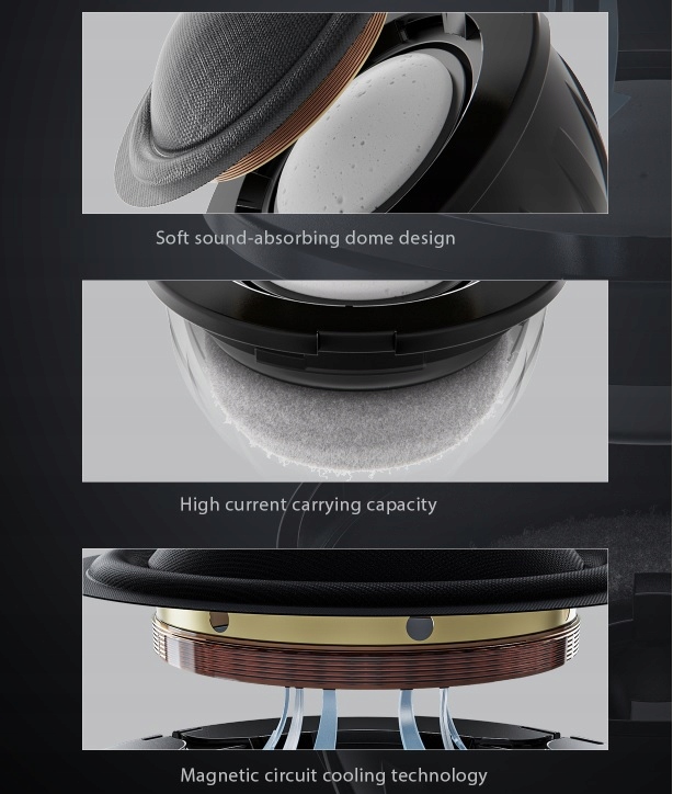 * Технологія охолодження магнітного контуру для Treble Dome: технологія гасіння вібрацій, яка використовувалася для охолодження магнітної рідини, що забезпечує кращу роздільну здатність і розширення високих частот.