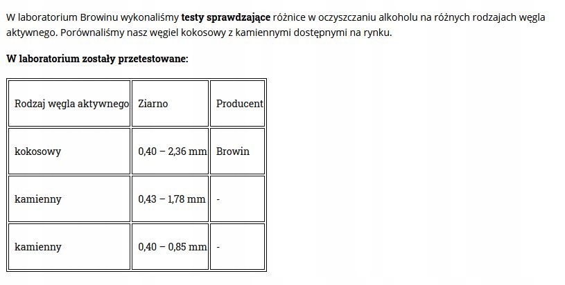 < Виготовлений спеціально для гармонізації (корекції) смаку і запаху питної води та алкогольних напоїв. Він випускається у формі гранул і є високоефективним адсорбентом багатьох речовин, які негативно впливають на смак і аромат дистилятів.Своїми унікальними властивостями поглинати небажані органічні сполуки він зобов’язаний своїй високопористій структурі, отриманій як результат спеціальної термічної обробки шкаралупи кокоса і дії пари.