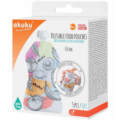 Пакети мають міцну подвійну застібку-блискавку, за допомогою якої ви можете зручно наповнювати їжу. Помістивши відповідну кількість закуски (макс. 150 мл) всередину, просто закрийте пакет натиснувши на мотузку по всій довжині та обережно натисніть на пакет, щоб перевірити, чи є щось витікає.