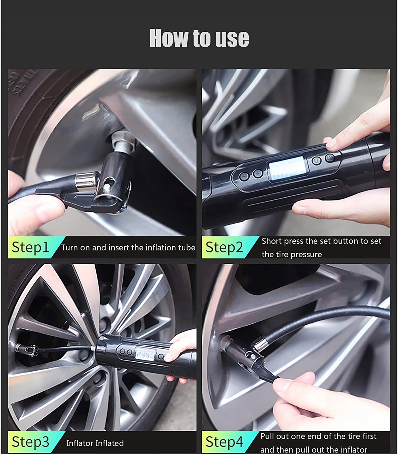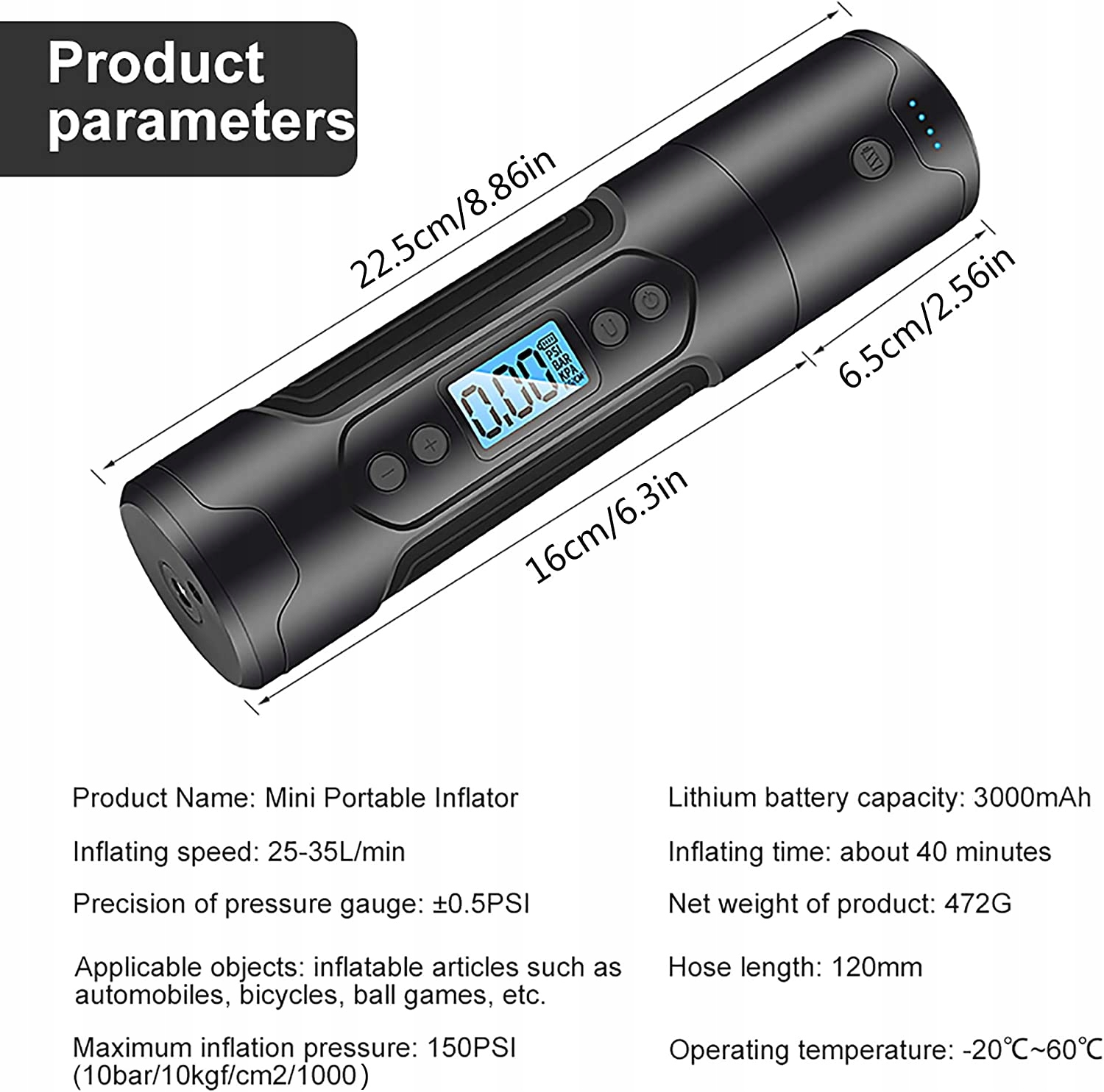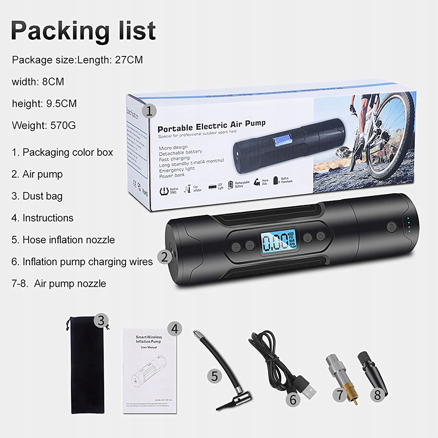 Вимірювання тиску в шинах Підключіться до нижньої шини та натисніть кнопку живлення, щоб активувати РК-екран і відобразити поточний тиск у шинах. Знімна конструкція зарядного пристрою для телефону дозволяє заряджати мобільний телефон одночасно. Акумулятор великої ємності Цей портативний літій-іонний акумулятор і USB-порт для заряджання підтримують швидке заряджання. Ви можете насолоджуватися ефективним заряджанням за допомогою акумулятора великої ємності загальною ємністю 3000 мА·год 1000 мА·год 3. Швидке автоматичне накачування Насос оснащений 4 перемикаючими одиницями тиску PSI KPA KG CM, щоб ви могли попередньо встановити тиск у шинах. Накачування шин автоматично вимикається при досягненні встановленого тиску в шинах. Нагнітач має максимальний тиск 150 psi. Багатофункціональний бездротовий дизайн дозволяє отримувати доступ до всіх шин, велосипедів, мотоциклів, автомобілів і позашляховиків. Оснащений 3 адаптерами для іграшкових матраців літака та спортивного обладнання. Можна використовувати як подарунки на день народження, різдвяні подарунки, подарунки на день подяки, ювілей або новорічні подарунки для батьків, родини, друзів. Полегшує їх подорожі. Невеликий за розміром, його можна носити з собою в автомобілі та легко помістити у вантажівку чи рюкзак. Походи на мотоциклі більш неквапливі.