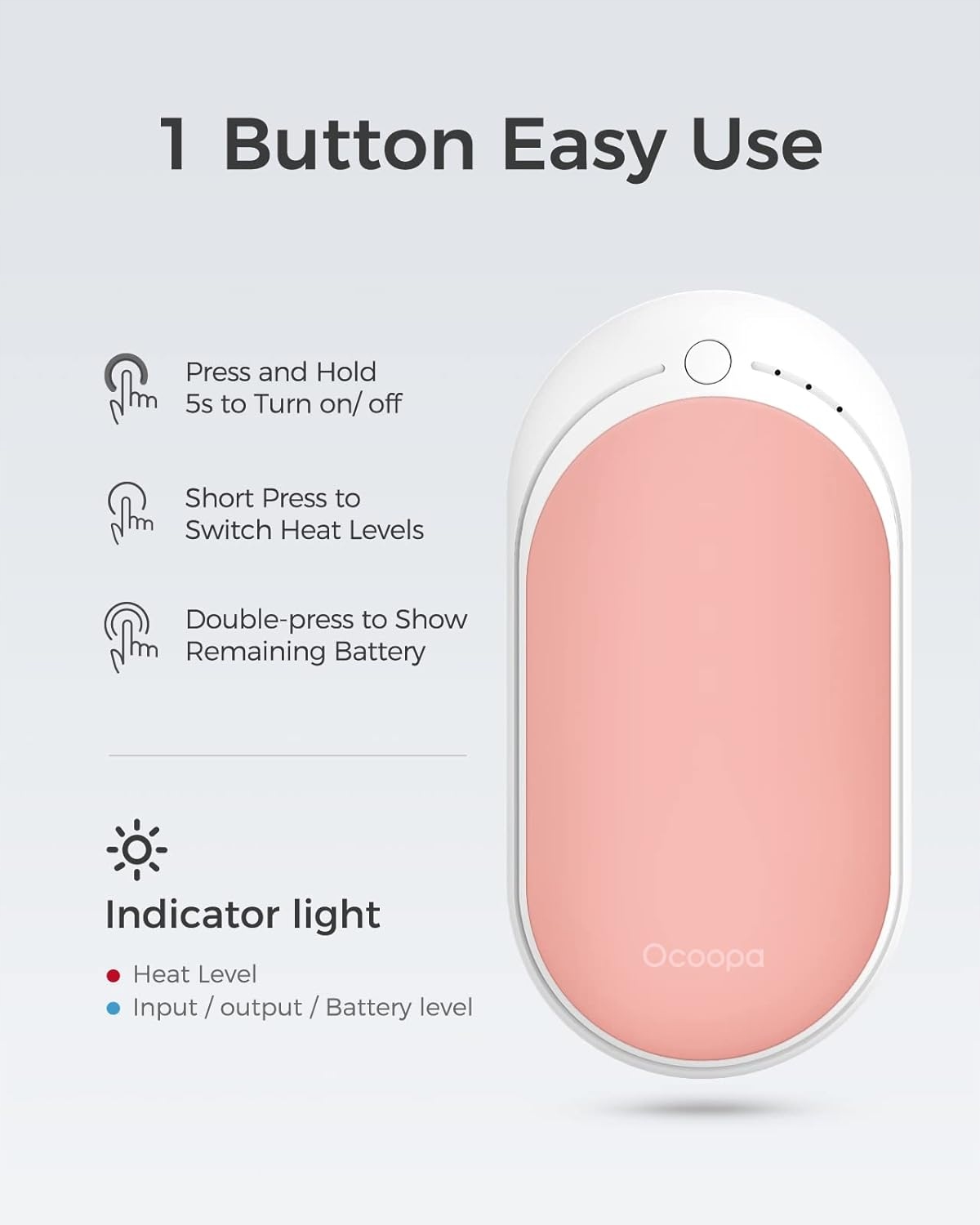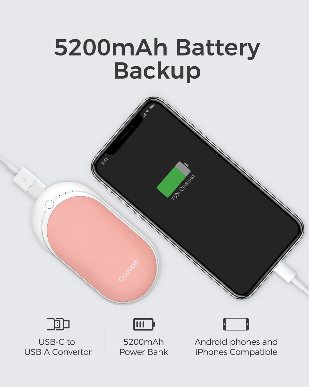 - USB-акумуляторна грілка для рук з великою ємністю акумулятора - літієві батареї 5200 мАг із зарядним портом USB C забезпечує тривалий термін служби. Його також можна використовувати як мобільне джерело живлення для заряджання ваших електронних пристроїв у будь-який час.