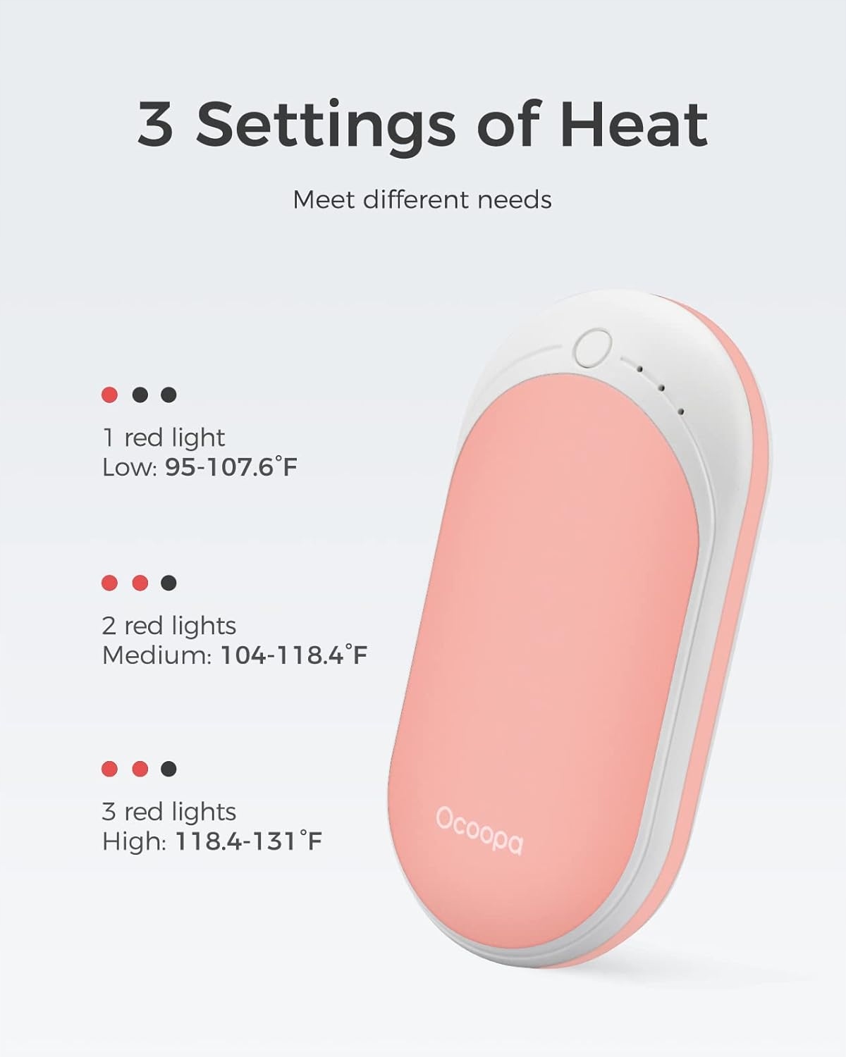 - 3 регульованих режиму нагріву. Миттєве виділення тепла. Швидке нагрівання з обох сторін за лічені секунди, щоб ваші руки були теплими. Ви можете вибрати між 3 рівнями температури: 95-107°F / 104-118°F / 118-131°F.