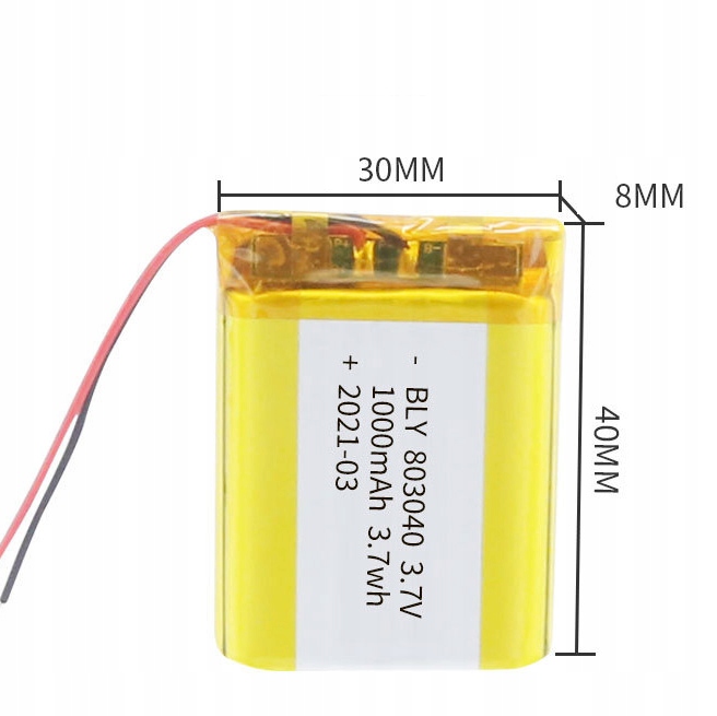 Акумулятор Li-Po Li-Polish 1000mAh 3.7 В PCM 40x30x8mmmcech Маленький полімерний акумулятор з ємністю 1000mAh акумулятор, що використовується в мобільних пристроях, таких як планшетів, навігація, ноутбуки. Часто використовується хобі в проектах саморобних або IoT. Він має вбудовану систему захисту від PCM (захист від перевантаження, надмірний розряд та коротке замикання). 4