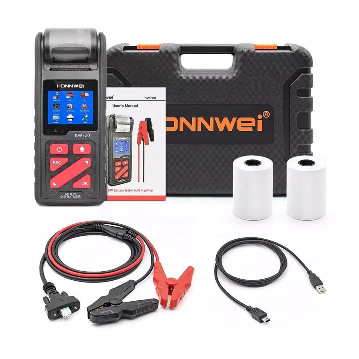 - Тестер KONWEI KW720: основний пристрій для діагностики та тестування акумуляторів.
