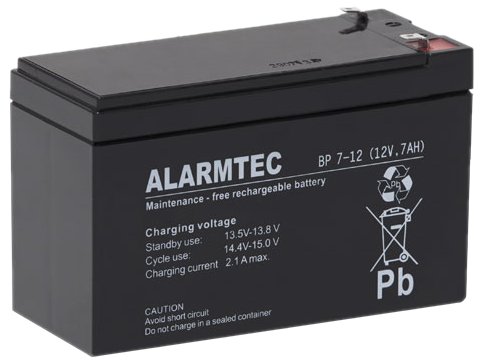 Необслуговувана батарея Alarmtec BP 7Ah 12 В– це необслуговувана батарея VRLA (свинцево-кислотна батарея з клапанним регулюванням, тобто з саморегульованими запобіжними клапанами та внутрішньою рекомбінацією газу) з уловленим електролітом в матовому сепараторі AGM (Absorbent Glass Mat), широко відомому як гель. Він присвячений буферним джерелам живлення, що використовуються в системах сигналізації, відеоспостереження, SSWiN, контролю доступу, системах протипожежного захисту (аварійне живлення), касових апаратах, телефонних станціях, аварійному освітленні, автоматиці тощо.