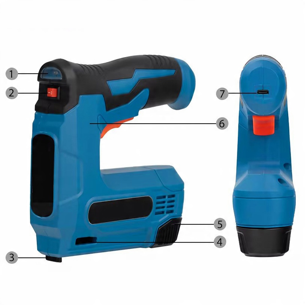 Цей електричний штаплер може працювати з 3 розміром скоб та 3/8 "" 18 -in -inception Nails з товщиною 18 до світла. Електричний пістолет для літієвих нігтів оснащений вимогами до роботи кнопки живлення, що трохи покращує продуктивність
