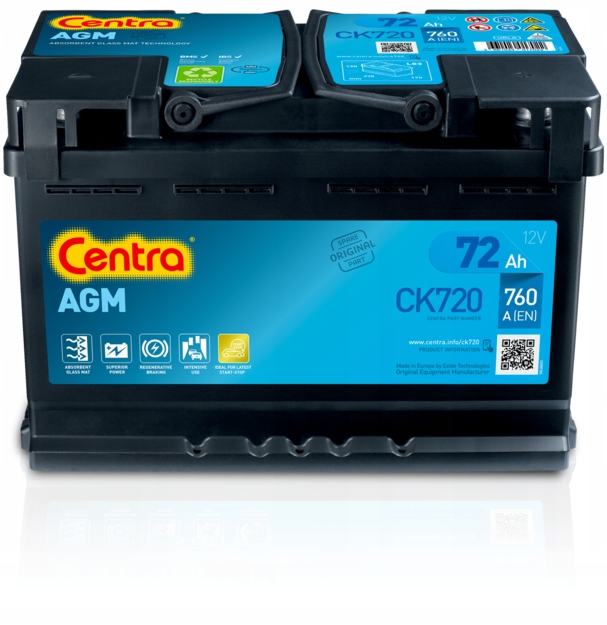 Акумуляторна батарея Centra AGM призначена для мікрогібридних автомобілів, обладнаних системою Start & Stop і системою рекуперативного гальмування. Завдяки технології AGM (Absorbent Glass Mat) цей тип акумуляторів забезпечує оптимальну роботу в екстремальних умовах експлуатації автомобіля, таких як система Start & Stop. Автомобіль, обладнаний такою системою, здійснює в кілька десятків разів більше стартів на добу, ніж автомобілі без цієї системи. Цей продукт також має здатність приймати високий заряд, що особливо важливо для рекуперативного гальмування та інтелектуального генератора змінного струму.