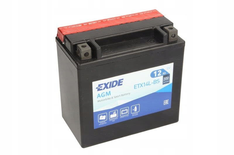 AGM/Стартовий/Сухозаряджений акумулятор з електролітом (обмежений продаж споживачам) EXIDE 12V 12Ah 200A P+ Необслуговуваний електроліт в комплекті 150x87x145 мм Сухий, заряджений електролітом YTX14L-BS