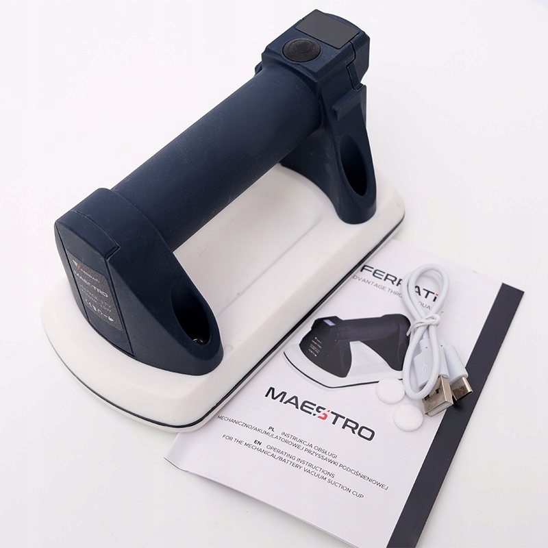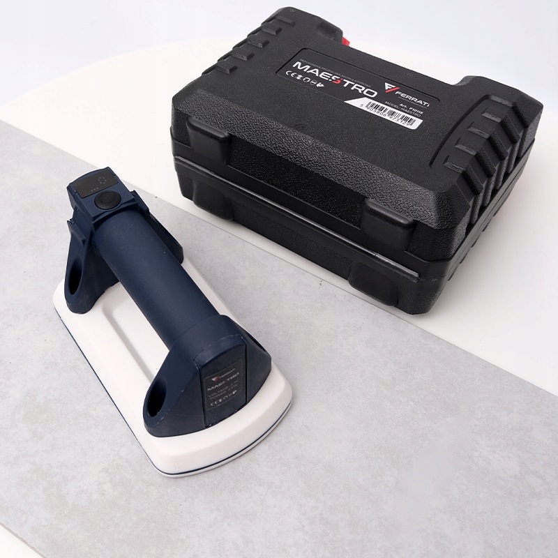 Maestro – це високоякісна автоматична вакуумна присоска з акумуляторним живленням, розроблена спеціально для роботи з панелями та плиткою менших розмірів. Завдяки своїй винятково компактній конструкції він ідеально підходить для форматів від 95 × 170 мм, забезпечуючи комфорт і безпеку роботи. Прилад оснащений автоматичним вакуумним насосом, який підтримує постійний рівень вакууму - навіть під час інтенсивного використання та з максимальною вантажопідйомністю до 100 кг. Це гарантує повний контроль над транспортованим матеріалом, а також комфорт і безпеку на кожному етапі роботи. Біла силіконова основа забезпечує відмінне зчеплення як з гладкими, так і з шорсткими поверхнями, незалежно від температури навколишнього середовища. Вбудований акумулятор на 1200 мАг, що заряджається через USB-C, забезпечує безперервну роботу, а швидкий час зарядки (до 3 годин - в залежності від зарядного пристрою) дозволяє ефективно організувати роботу на будівельному майданчику. Все це укладено в міцний транспортний футляр, який захищає пристрій під час зберігання та полегшує його безпечне переміщення.