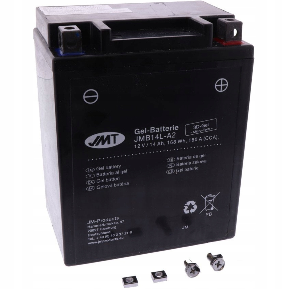 6. Виробник JMT 7. Гель типу 8. Напруга [V] 12 9. Вага [кг] 4,5 10. Висота [мм] 160 11. Початковий струм [A] 170 12. Електроліт у наборі не застосовується