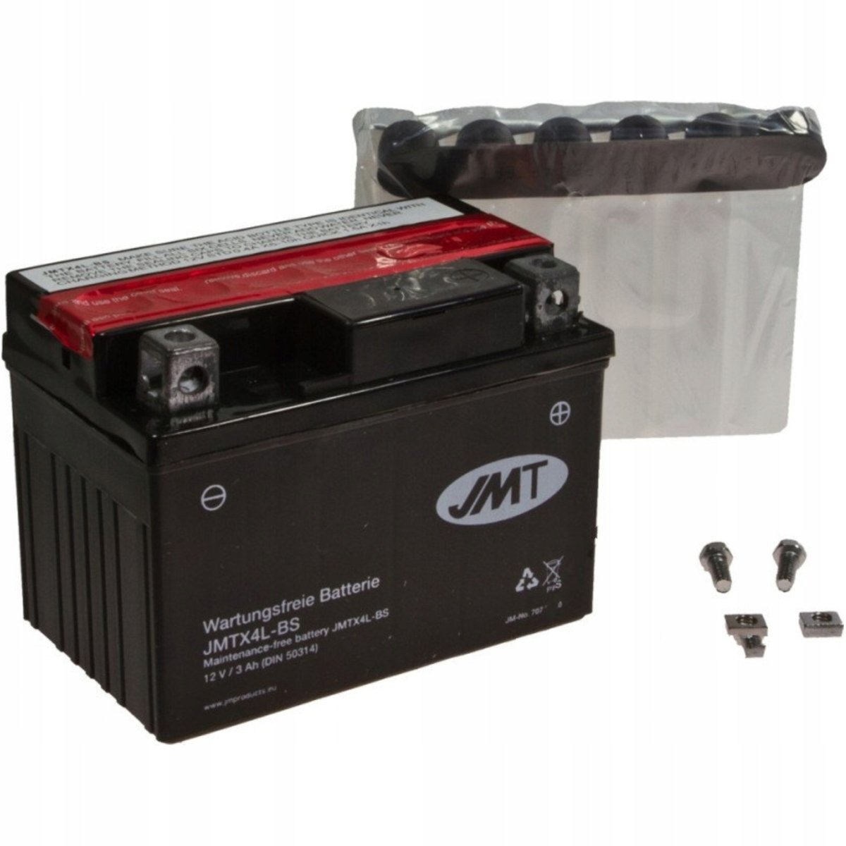 Акумулятор, що постачається з електролітним бака. Він не був активований, і після затоплення його електролітом слід додати відповідно до показань, описаних нижче. За останні кілька років акумулятори JMT повністю змінили обличчя. Завдяки використанню повністю автоматизованої виробничої лінії, в даний час виробляються акумулятори JMT, представляють найвищий глобальний технологічний рівень. Відносно низька ціна означає, що акумулятори JMT є найкращим рішенням на ринку мотоциклістів. Рівень заряду можна перевірити альтернативно за допомогою метра напруги. Якщо це 6,1 В (6 В акумулятор) або 12,2 В (12 В акумулятор), акумулятор повинен бути наповнений рівним або менше 1/10 ємності акумулятора. Приклад: акумулятор 8AH повинен бути заряджений значенням 0,8 a.